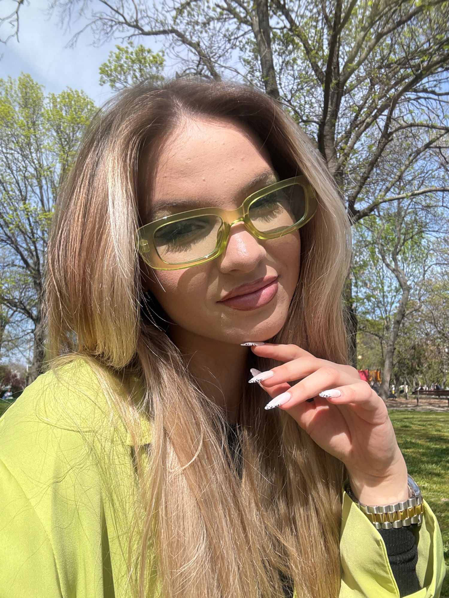 A close-up outdoor selfie, taken in Plovdiv, Bulgaria, features a person, likely female, from the chest up, posing on a bright, sunny day. The subject has long, flowing blonde hair that frames her fac…read more