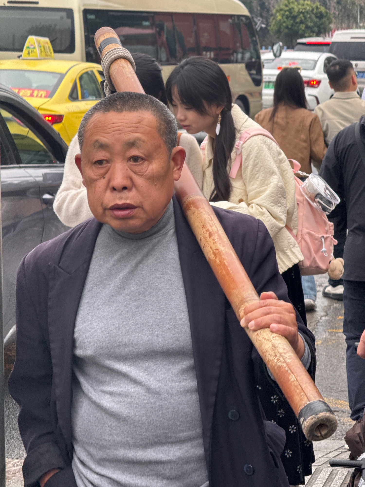 This image captures an outdoor urban scene in Nan'an District, China, on a wet or damp day. In the foreground, an elderly East Asian male, with short, greying hair and a neutral expression, looks slig…read more
