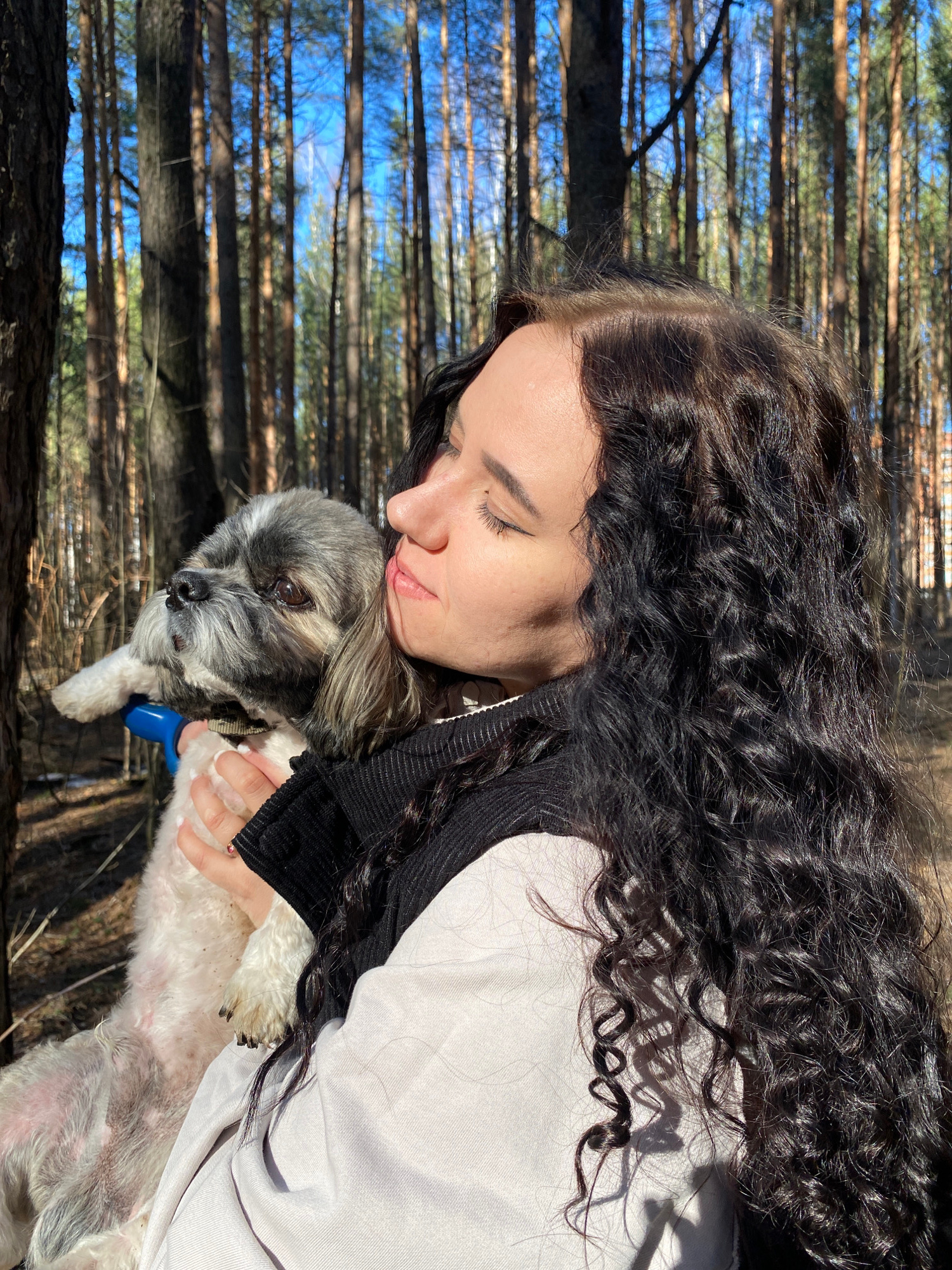 A woman with long, dark, curly hair embraces a small, gray and white dog in a wooded area. The dog wears a blue collar and leash. The woman is wearing a black sweater under a light-colored jacket. The…read more