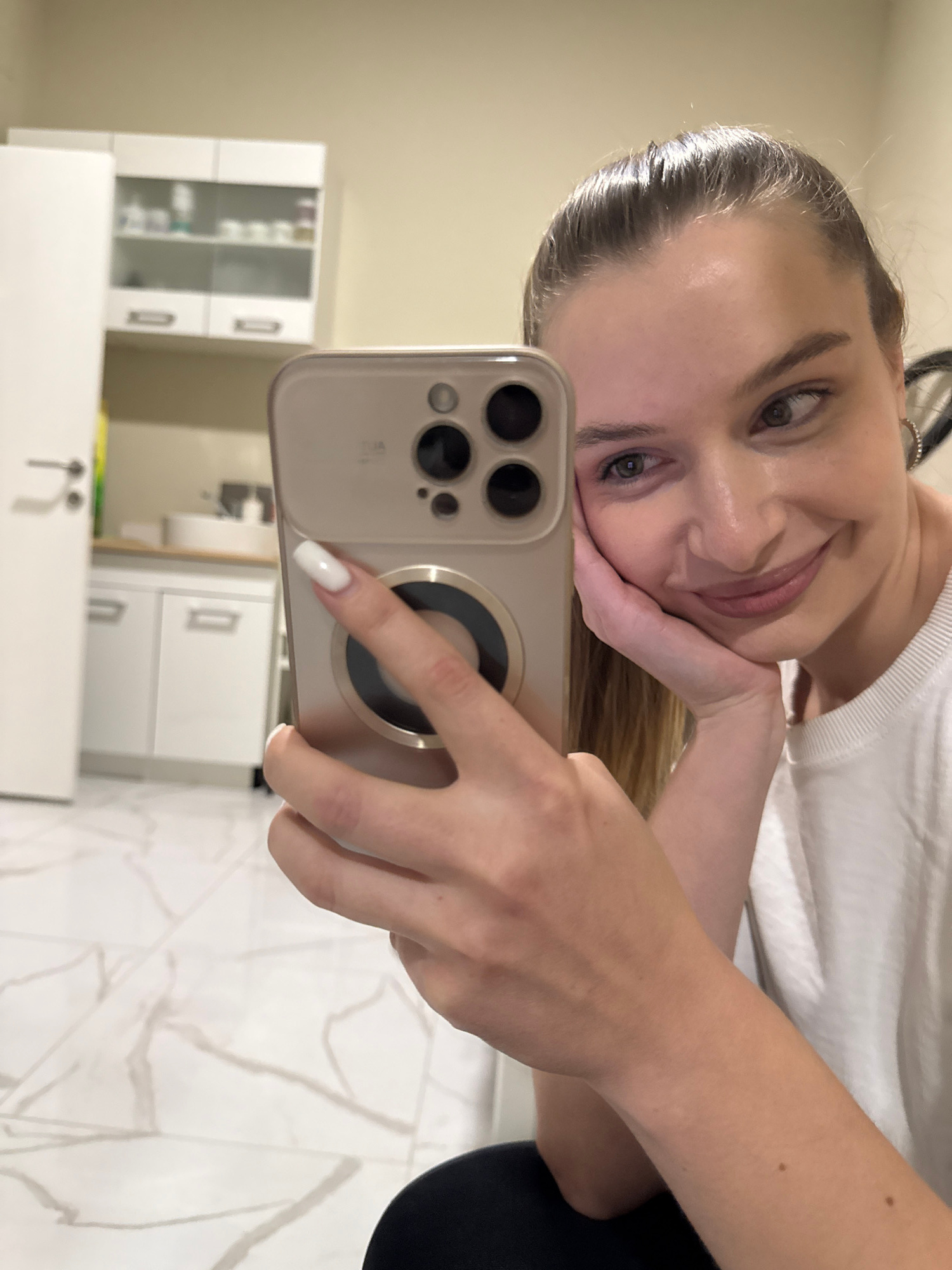 A woman is taking a selfie with an iPhone. The background appears to be a bathroom with white cabinets and a marble floor. The location is unlikely to be determined as being in the city of Budva, Mont…read more