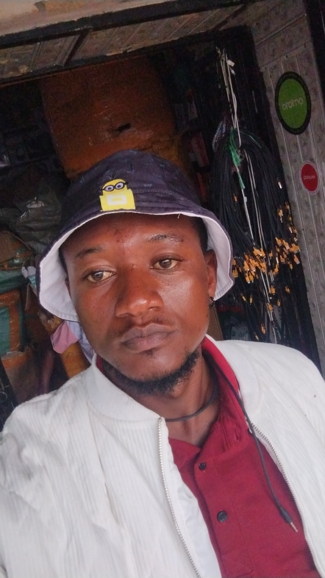 The image shows a person wearing a white jacket, red shirt, and a dark-colored hat with a Minion cartoon character on it. The person has a beard. The background includes items possibly stored in a roo…read more