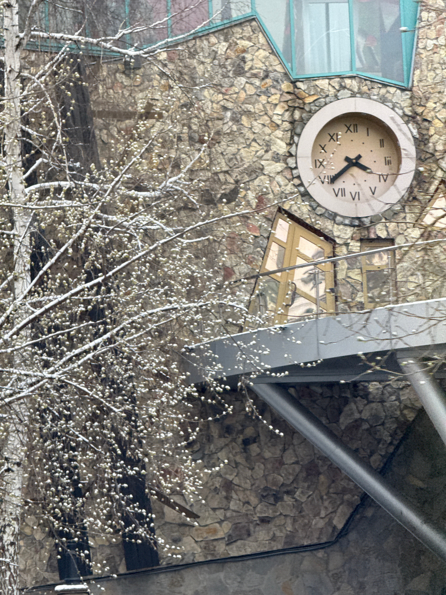 The image displays an outdoor scene featuring a stone-clad building facade, partially obscured by budding trees. A large, round outdoor clock with Roman numerals (I, II, IIII, V, VI, VII, VIII, IX, X,…read more