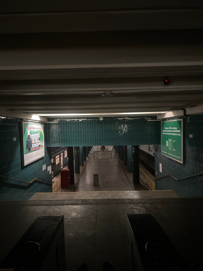The image displays the interior of a metro station in Kyiv, Ukraine, observed from the top of a staircase descending towards the platform. The environment is dimly illuminated by artificial overhead l…read more