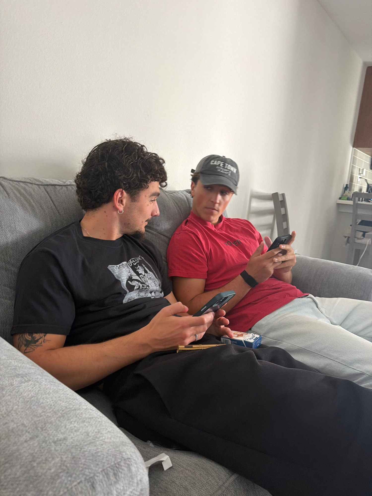Two young men are shown lounging on a grey upholstered couch in a bright, minimalist indoor setting, likely a living room, in Redondo Beach, United States of America. The room features stark white walβ¦read more