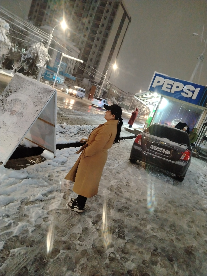 A woman in a tan coat and black cap stands on a snowy, slushy street. In the background is a Pepsi-branded stand, a dark-colored car with the license plate "01 R 846 ZC", and a tall building. Streetli…read more