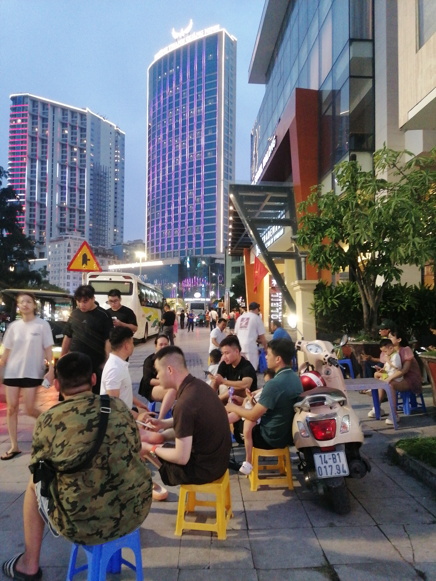 The photograph captures an outdoor scene in Bai Chay Ward, Vietnam. Several individuals are seated on small, colorful plastic stools along a sidewalk, engaged in conversation or activities. A beige sc…read more