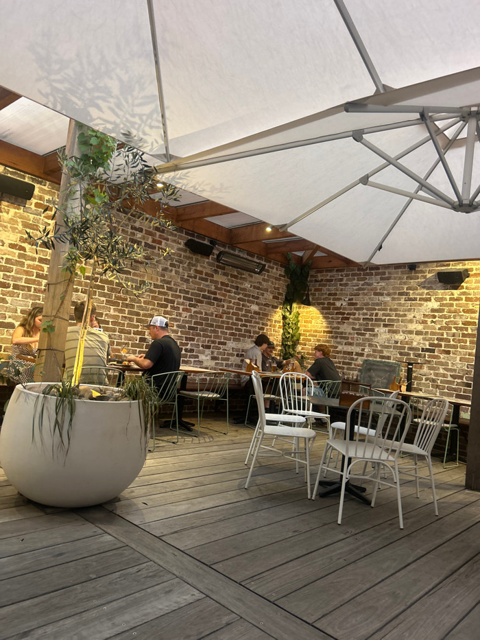 The image depicts an outdoor patio dining area, located in Bulli, Australia. The floor is composed of greyish-brown wooden decking. An exposed red brick wall forms the background, featuring two wall-m…read more