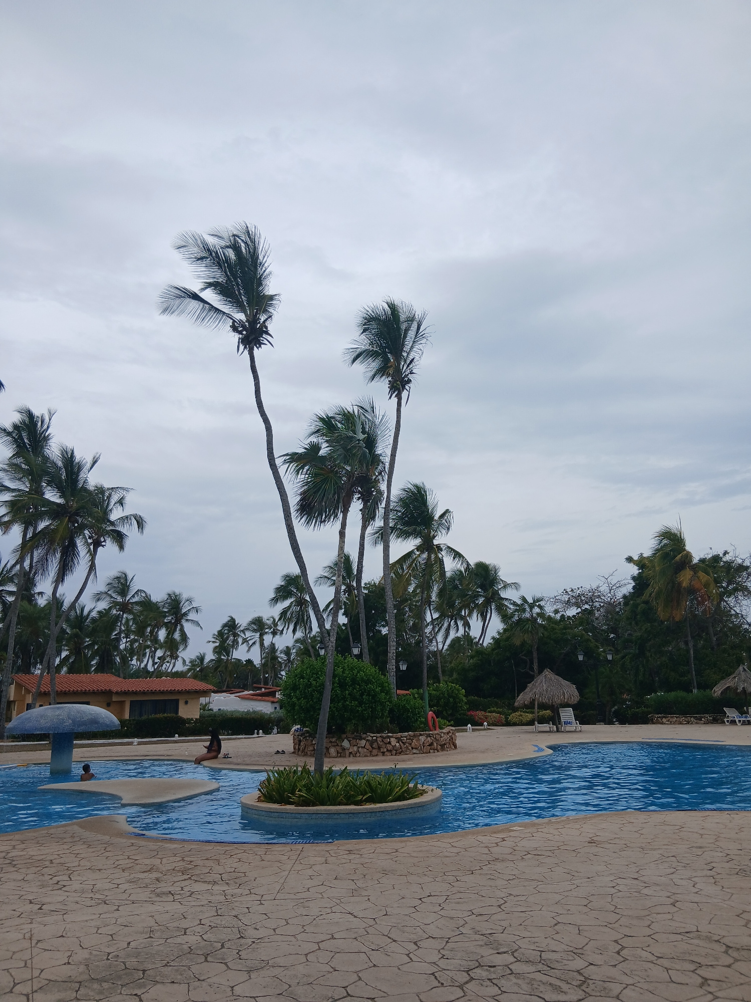 The scene shows a swimming pool area, likely in a tropical resort in Playa El Agua, Venezuela. The sky is overcast. The pool has a light blue color and is surrounded by a patterned concrete surface. P…read more