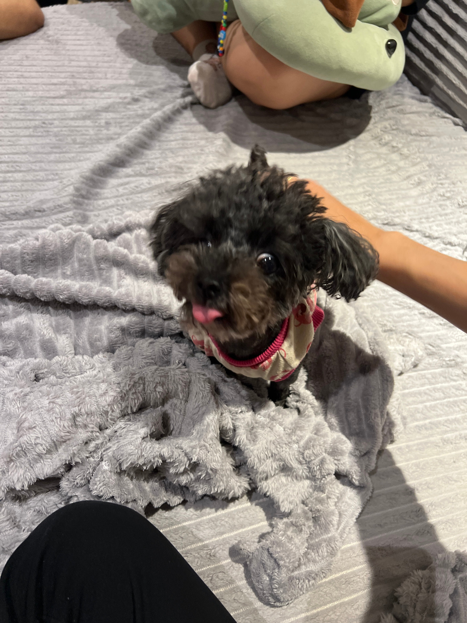 A black poodle wearing a pink and white floral patterned garment is held by a person. The poodle is on a gray, textured blanket. A plush green turtle toy lies to the left. A person's leg clad in black…read more