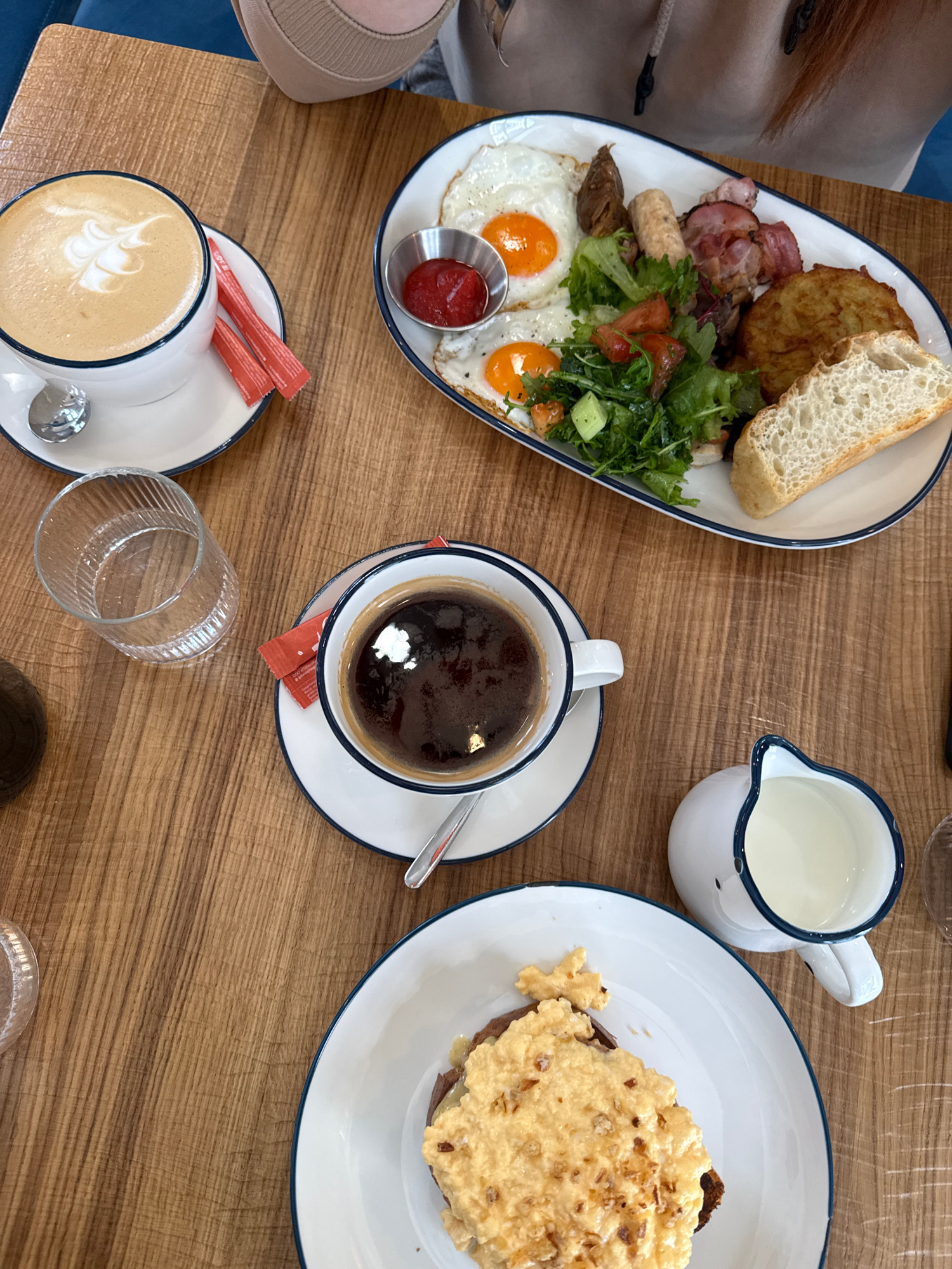 The image depicts a top-down view of a wooden table set with a breakfast meal, likely taken in Krasnoyarsk, Russia, based on the style of food and drink. On the left, a white plate with a blue rim contains a full English breakfast: two fried eggs with runny yolks, a small metal container of ketchup, several pieces of sausage and bacon, a fried potato cake, a slice of bread, and a mixed green salad with tomato and cucumber. Next to this plate, a fair-skinned person's upper body, including their shoulder and a beige garment, is partially visible. To the right, a white pitcher with a blue rim is filled with milk or cream. Adjacent to this is a white saucer with a blue rim holding a white coffee cup, also with a blue rim, filled with dark coffee. A metal spoon rests on the saucer. Two red sugar packets sit beside the cup. In the lower left corner, a white coffee cup with a blue rim on a matching saucer contains a latte with latte art. A small metal spoon lies beside the cup. Next to this is a clear ribbed glass, likely empty. Further to the right, a white plate with a blue rim holds a serving of scrambled eggs on toast. The wooden table has a visible grain pattern. Two unidentified objects are at the bottom right. | Open Wire