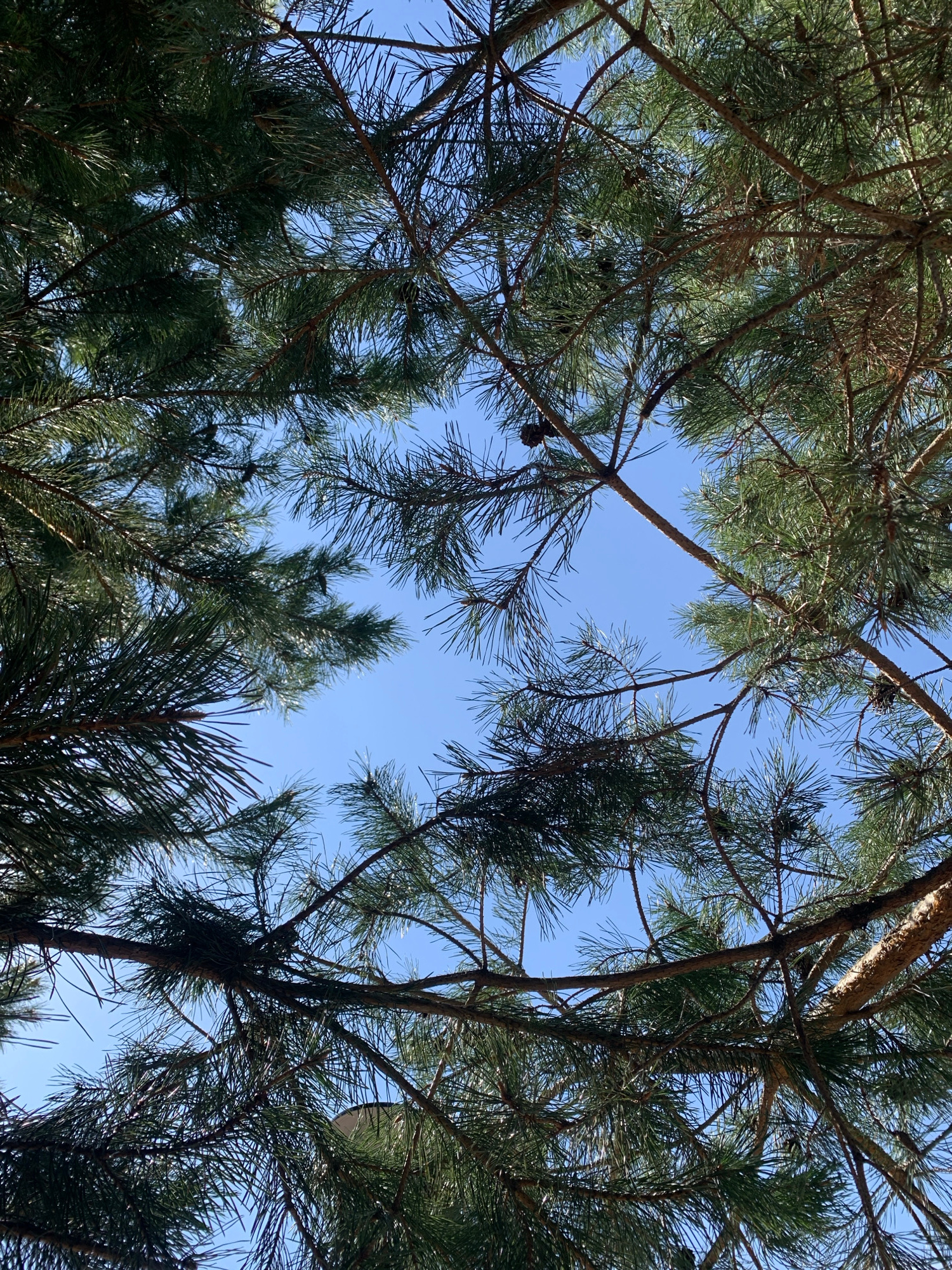 The image shows a view looking up through pine trees towards a clear blue sky. The location in the city of Chaikovsky, Russia is not discernible from the visual information provided. The scene consist…read more