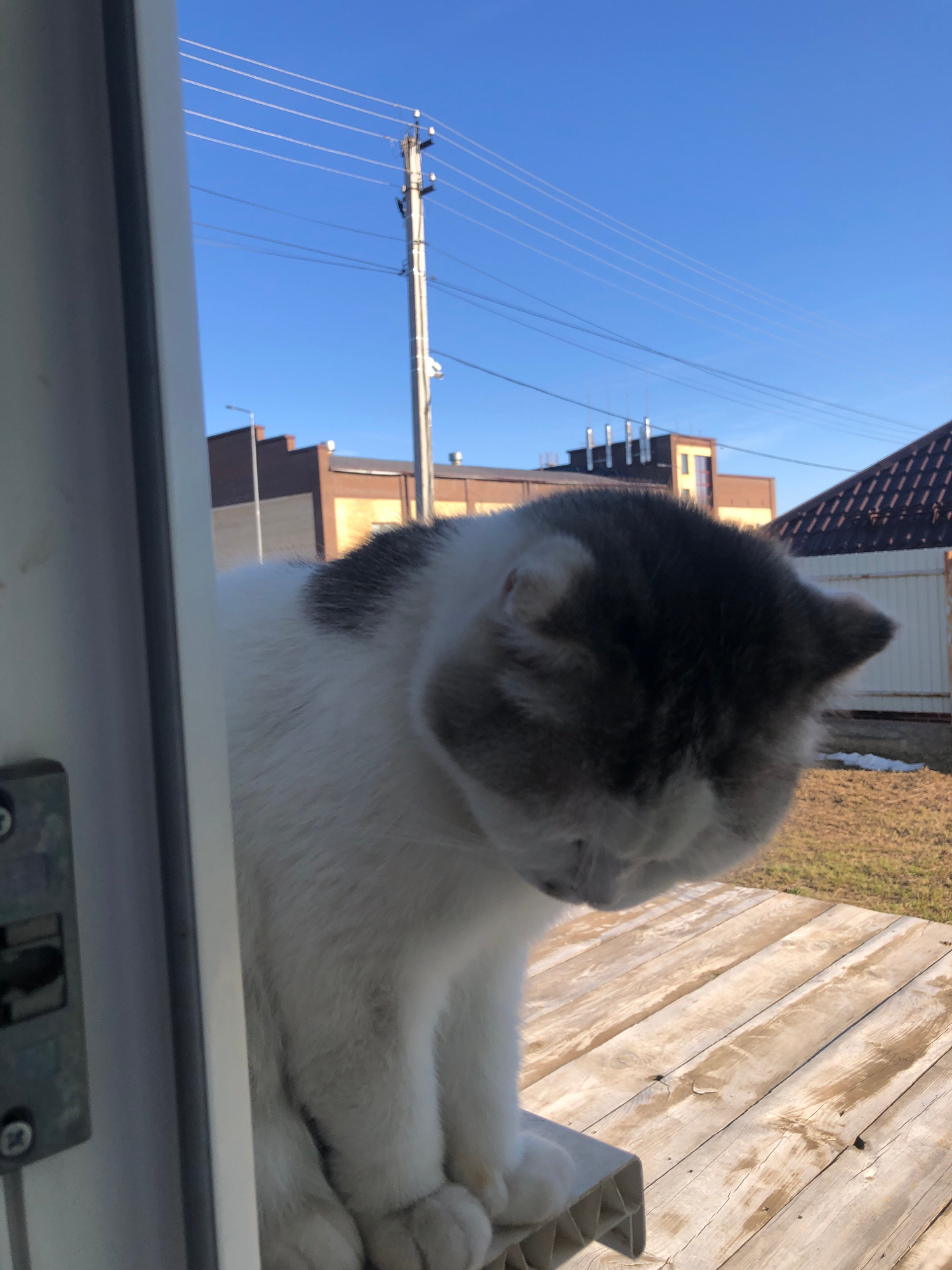 A white and grey cat is captured in a low-angle shot, resting on what appears to be a windowsill or ledge, looking out into a sunny outdoor scene. The cat is predominantly white with patches of dark gā¦read more