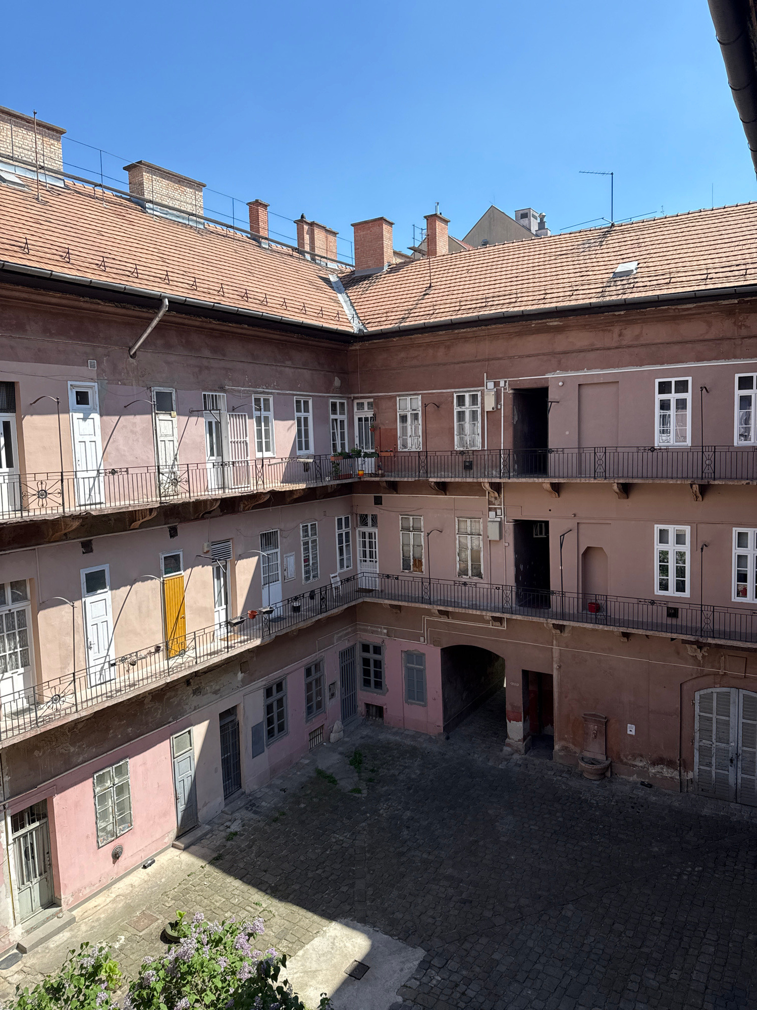 This image captures an overhead view looking down into an inner courtyard of multi-story buildings, typical of urban architecture in Budapest, Hungary. The clear, bright blue sky indicates a sunny day…read more