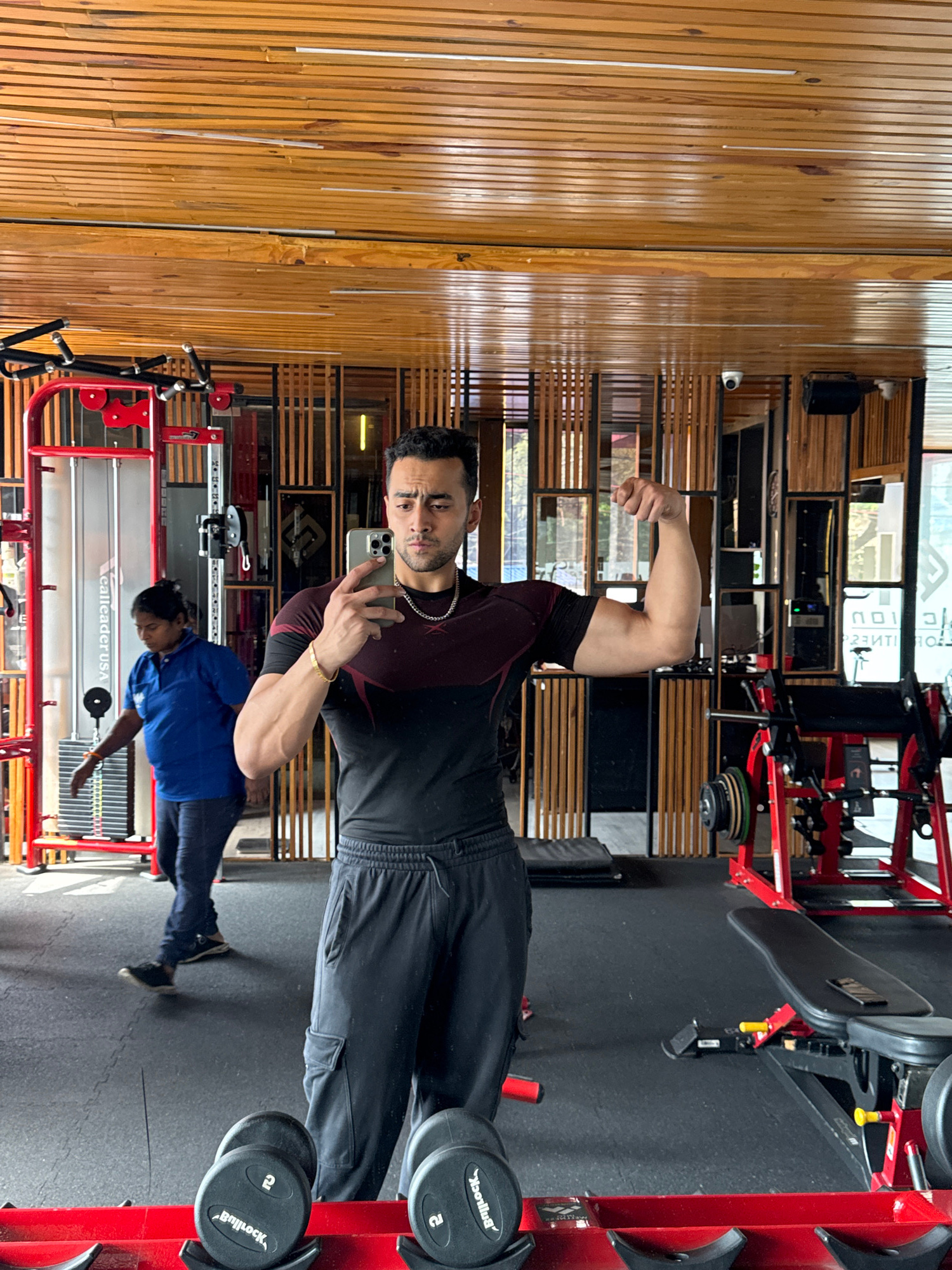 The image captures a man taking a selfie in what appears to be a gymnasium. He is wearing black and maroon workout attire and flexing his arm. In the background, another person in a blue shirt is visi…read more