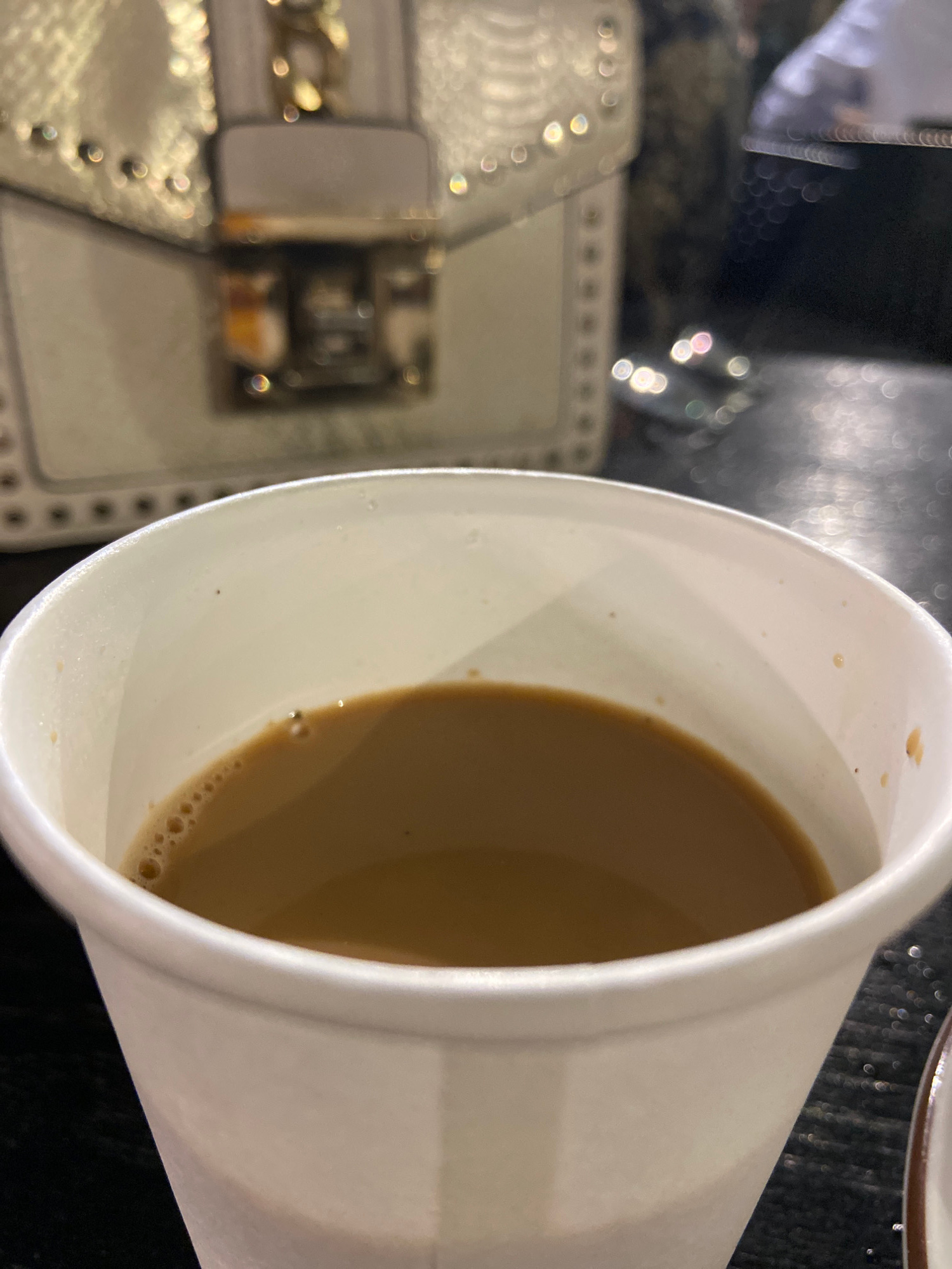 A close-up, high-angle shot focuses on a white paper cup filled with a light brown liquid, likely coffee with milk or creamer. The cup occupies the majority of the frame. To the left of the cup is a b…read more