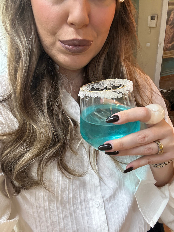 This close-up, overhead shot, rotated 90 degrees counter-clockwise, features a person partially visible, focusing on their face, hair, and hand holding a drink. The person, likely female, has long, w…read more
