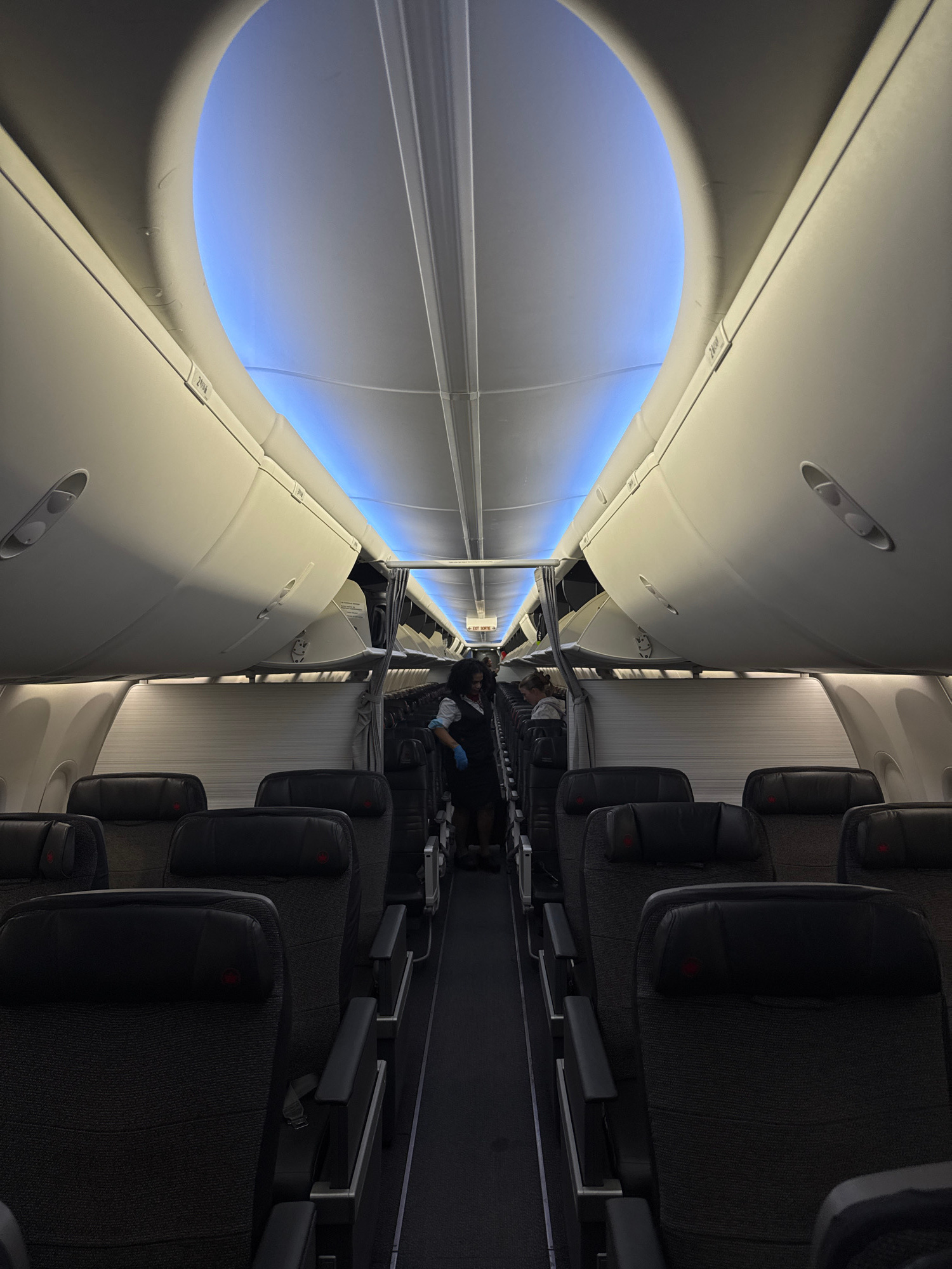 The image depicts the interior of an Air Canada aircraft cabin, likely located at Vancouver International Airport (YVR) in Richmond, Canada. The perspective is from the rear of the aircraft, looking f…read more