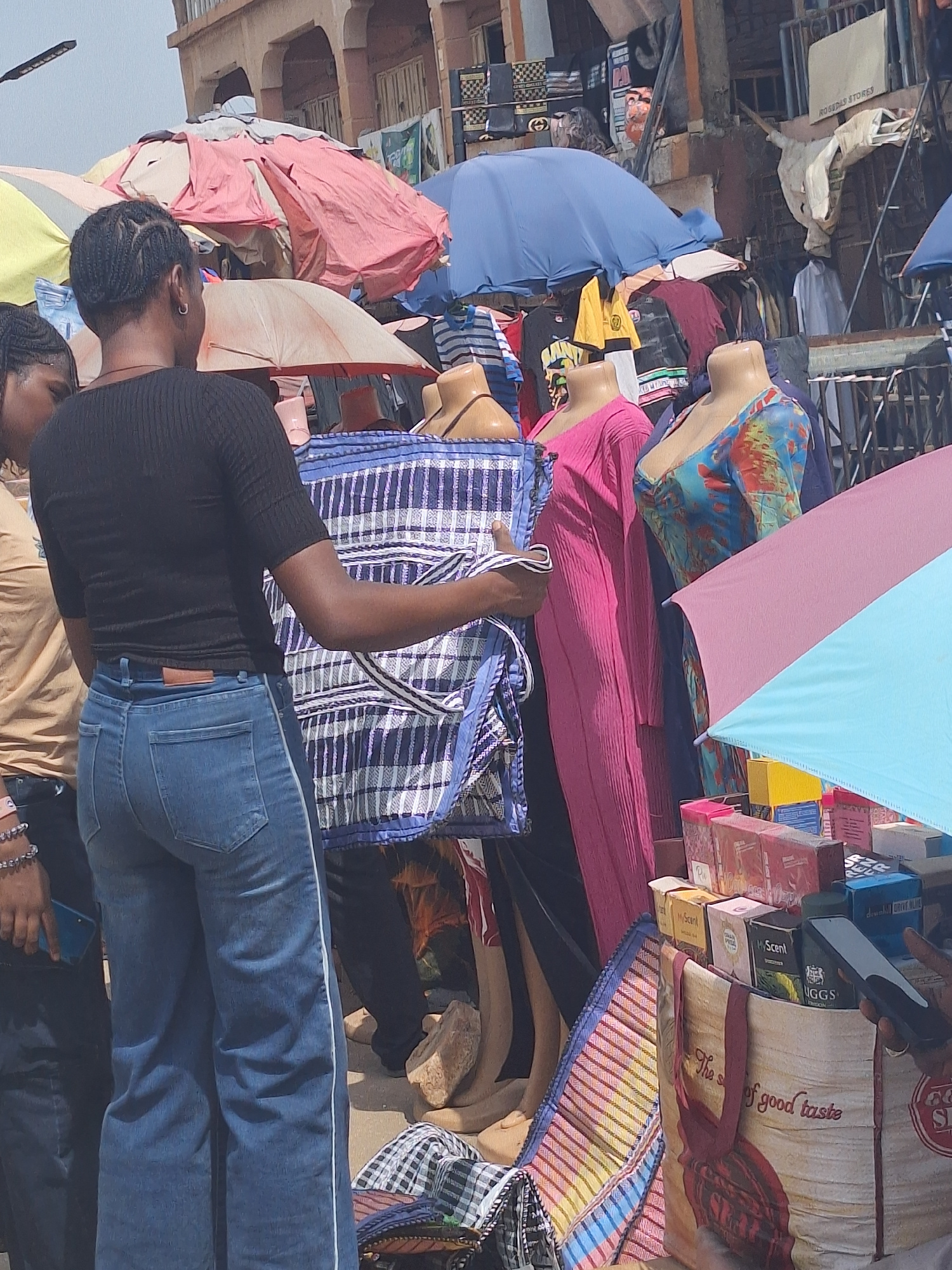 The image depicts a market scene in Sabon Tasha, Nigeria. Mannequins are dressed in pink and blue patterned clothing. Various textiles and items, including an umbrella with pink and blue sections and…read more
