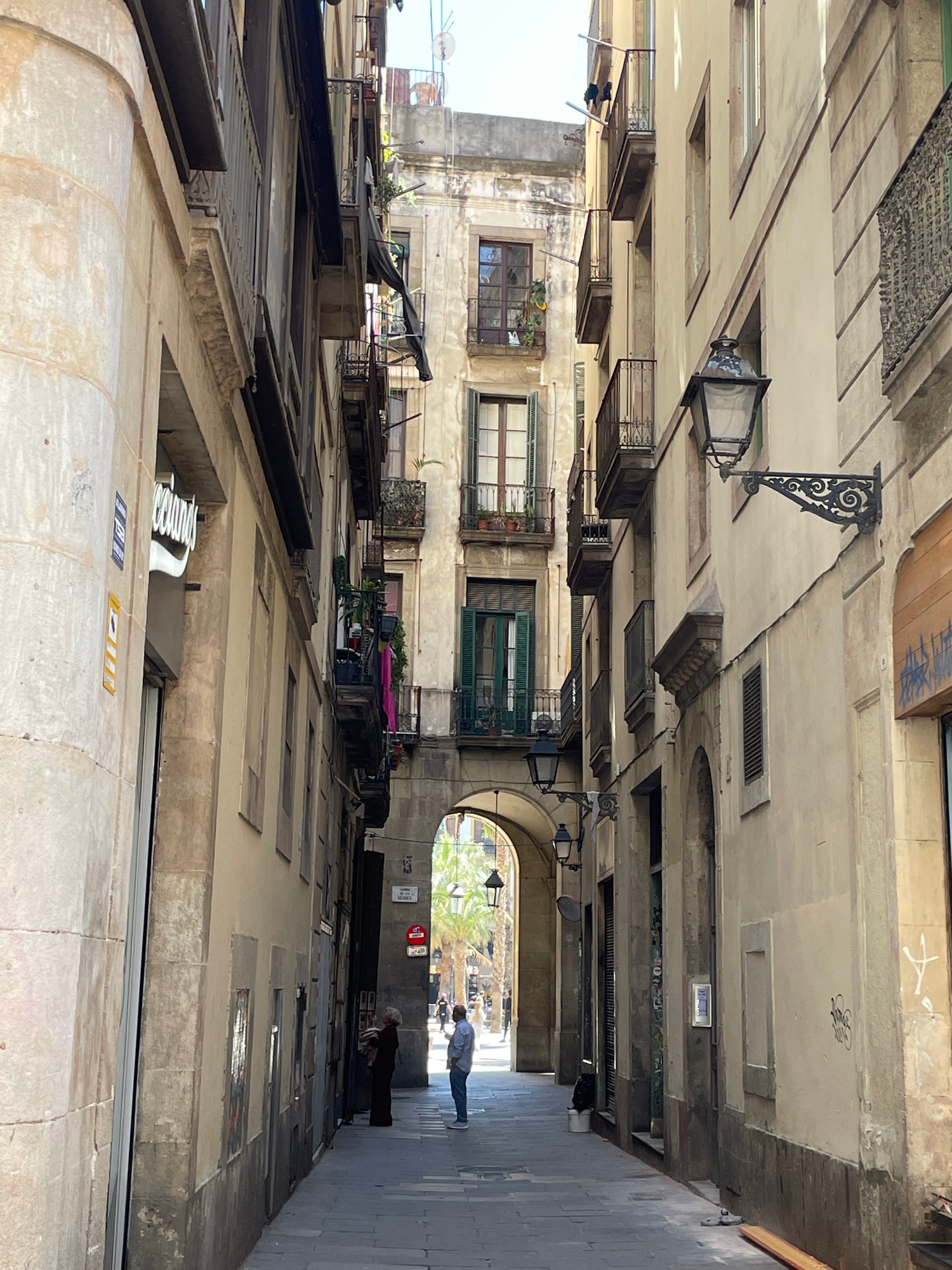 The image depicts a narrow, historic alleyway or covered passage in a European city, confirmed to be Barcelona, Spain. Tall, multi-story buildings of stone or stucco line both sides, creating a canyon…read more
