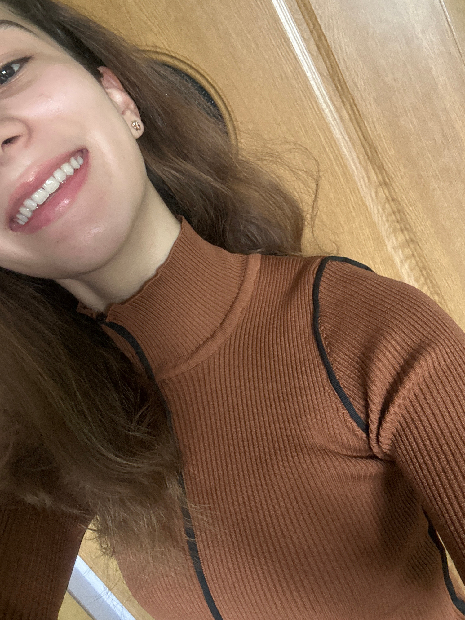 The image is a selfie of a woman with long, brown hair. She is wearing a brown, ribbed sweater with black trim. Her face is partially visible, showing her eye, nose, and mouth with white teeth. She is…read more