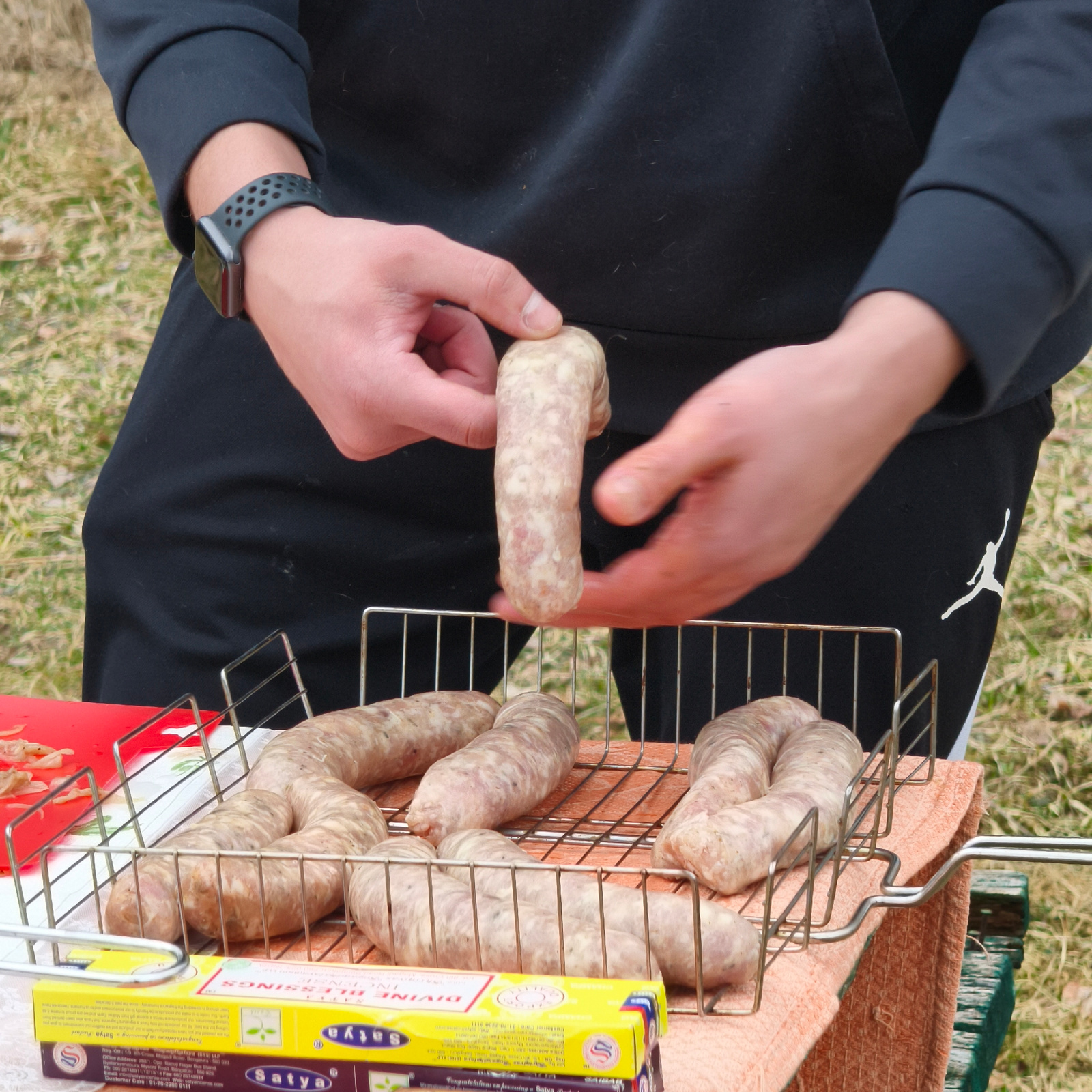 A person is preparing sausages for grilling outdoors. They are holding one sausage in their hands above a grilling basket containing several more uncooked sausages. The person is wearing black sweatpa…read more