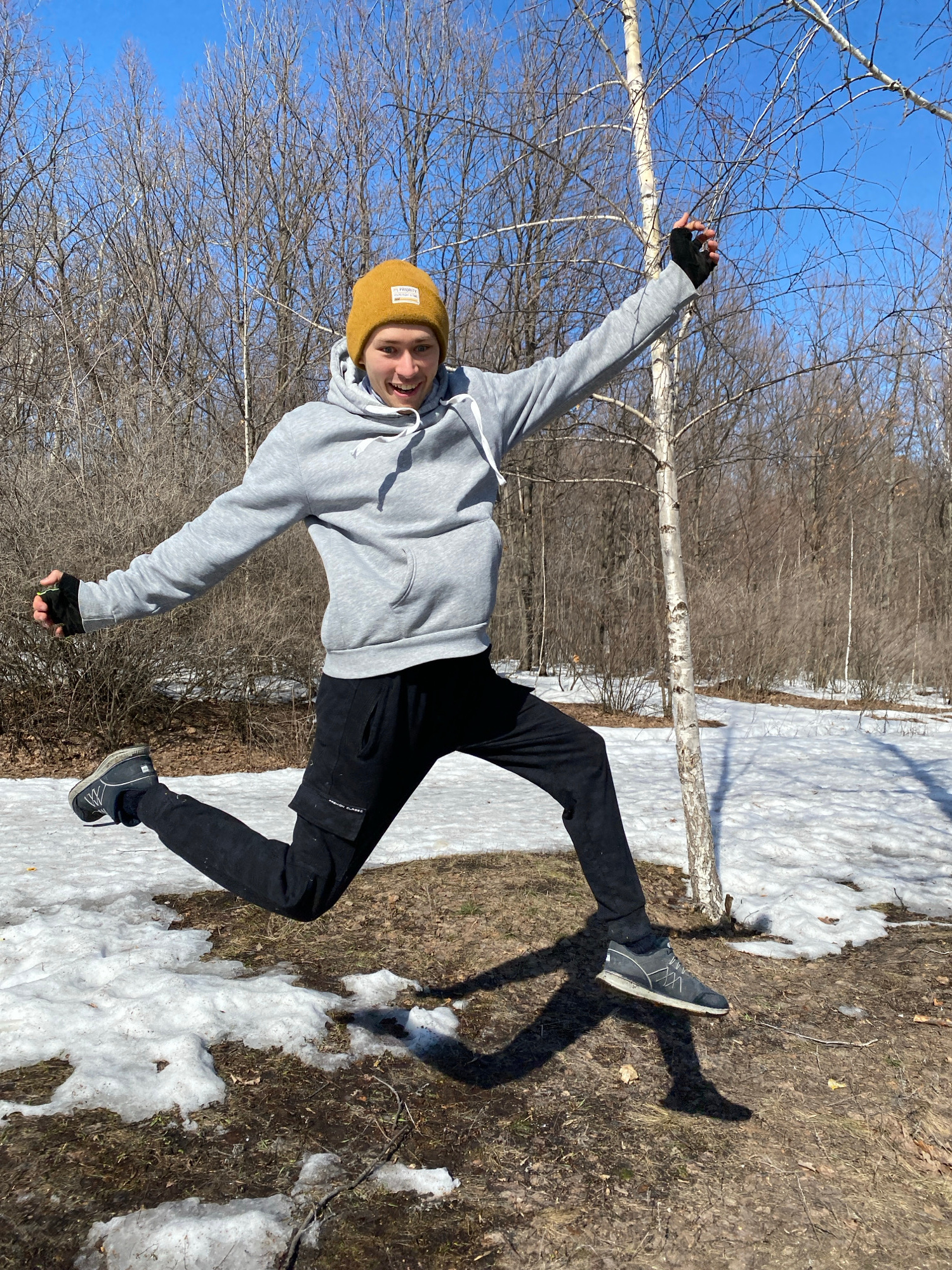 A young man is photographed outdoors, with his body positioned diagonally across the frame, appearing to be captured in a dynamic pose. He wears a light grey hooded sweatshirt, black pants, fingerless…read more