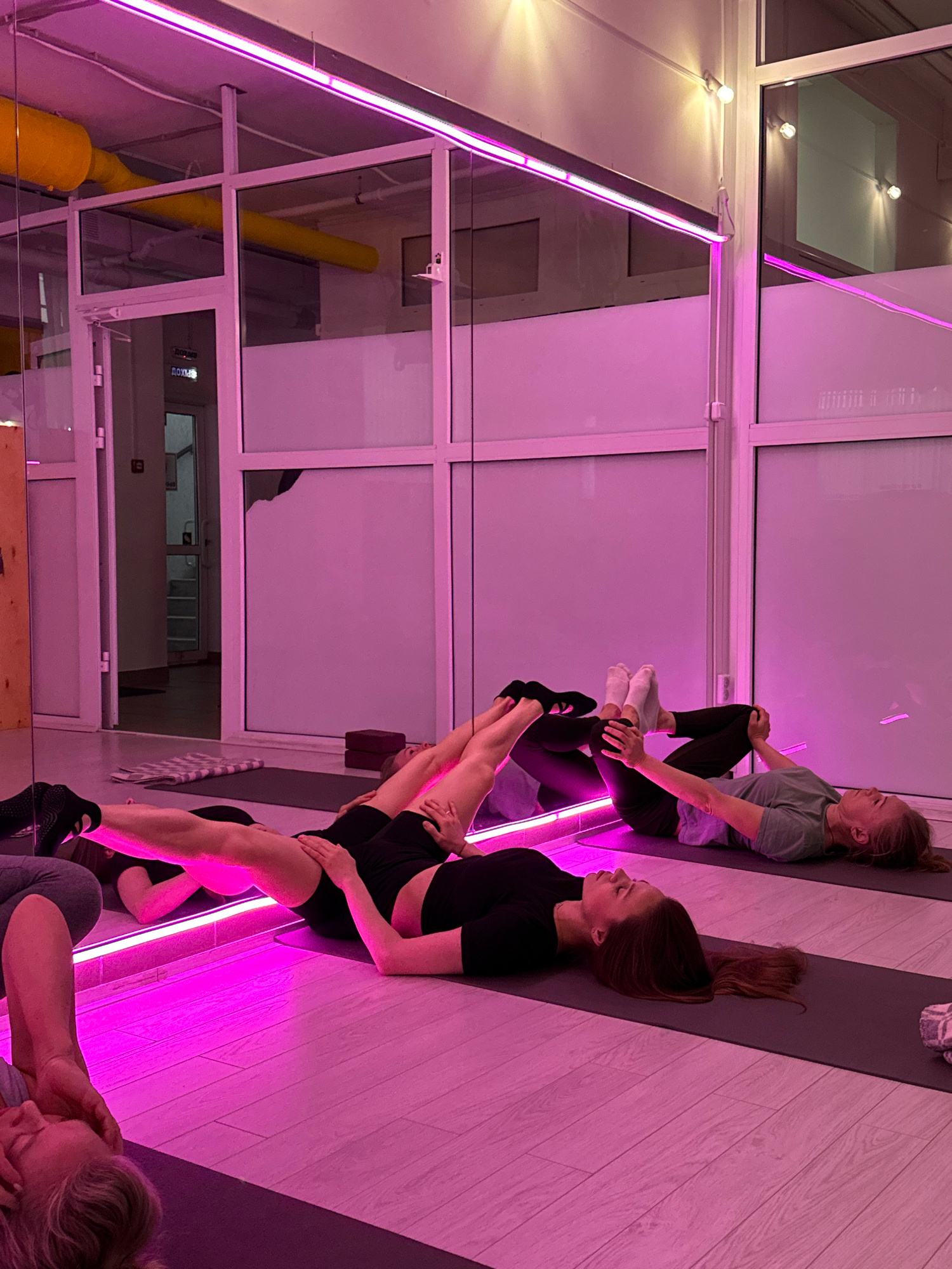 This media file captures an indoor fitness or yoga class, likely in the evening, characterized by strong pink ambient lighting. The perspective is rotated, showing several women engaged in exercise on…read more