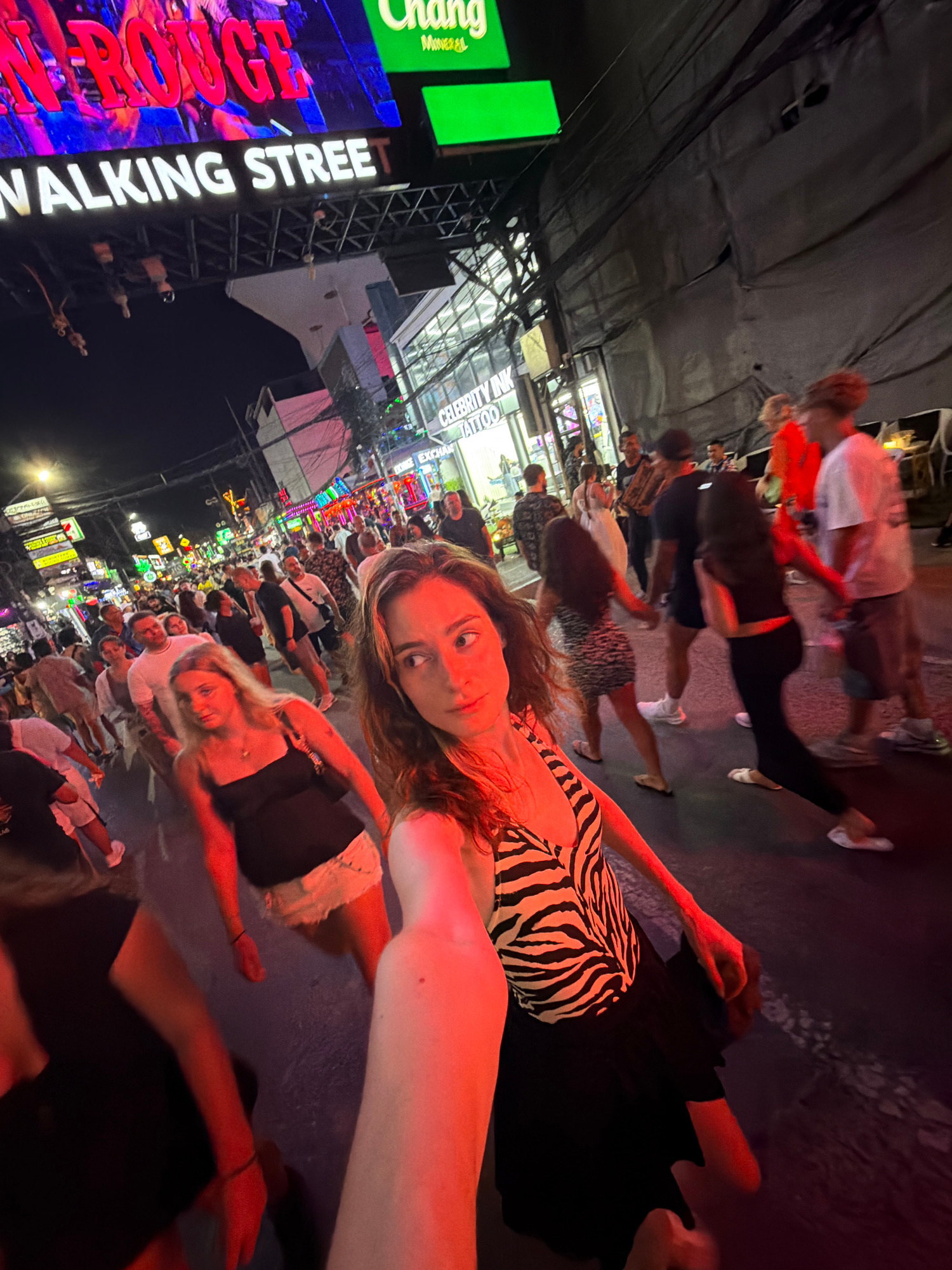 The image depicts a crowded nighttime street scene on Bangla Road in Patong, Phuket, Thailand, identifiable by the prominent "WALKING STREET" sign overhead and a "Chang Mineral" beverage sign. In the…read more