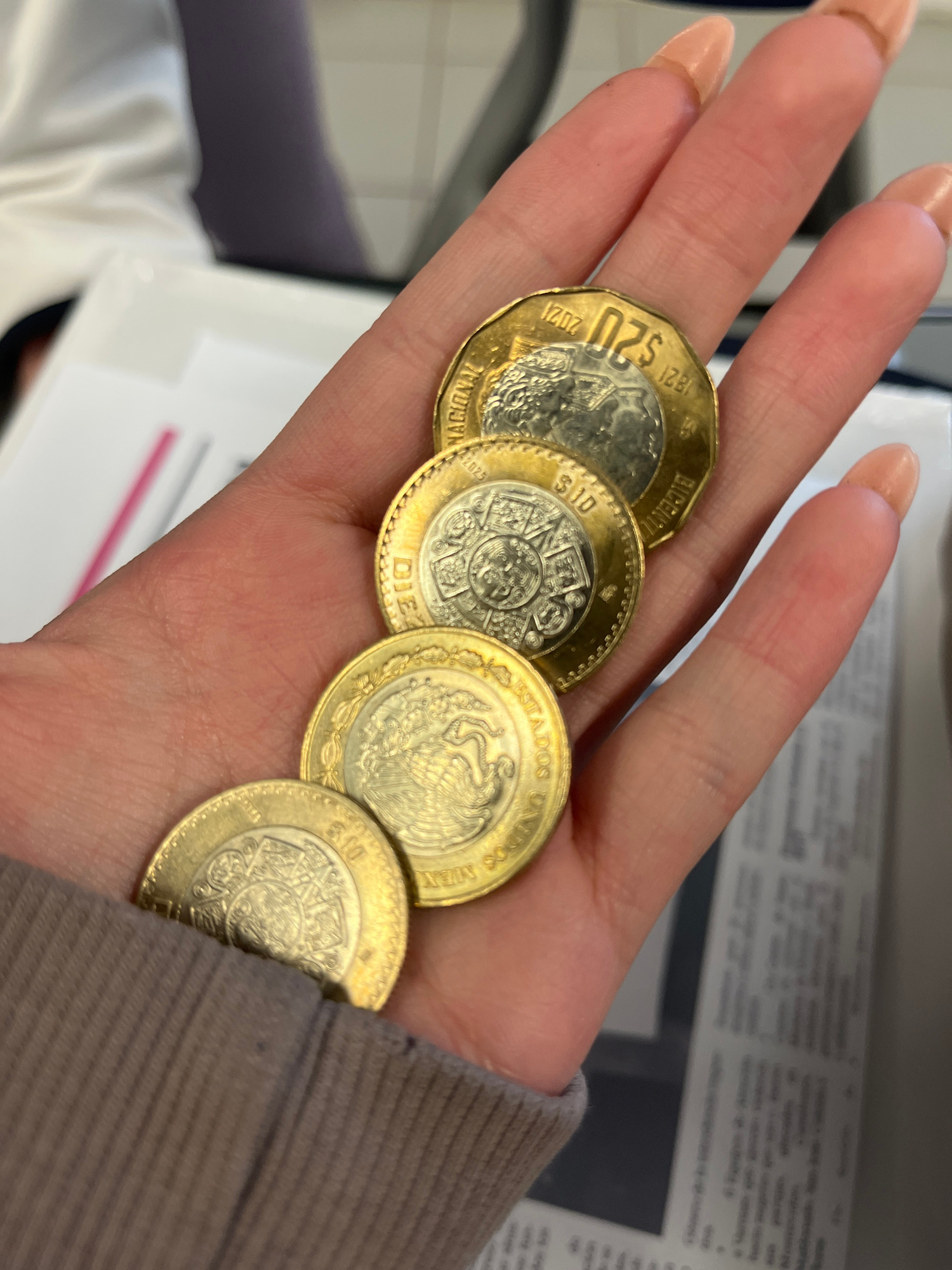 A human hand, likely female, holds four Mexican bimetallic coins in a slight cascade. The hand exhibits light to medium skin tone and manicured, long, peach-colored fingernails. A light brown ribbed s…read more