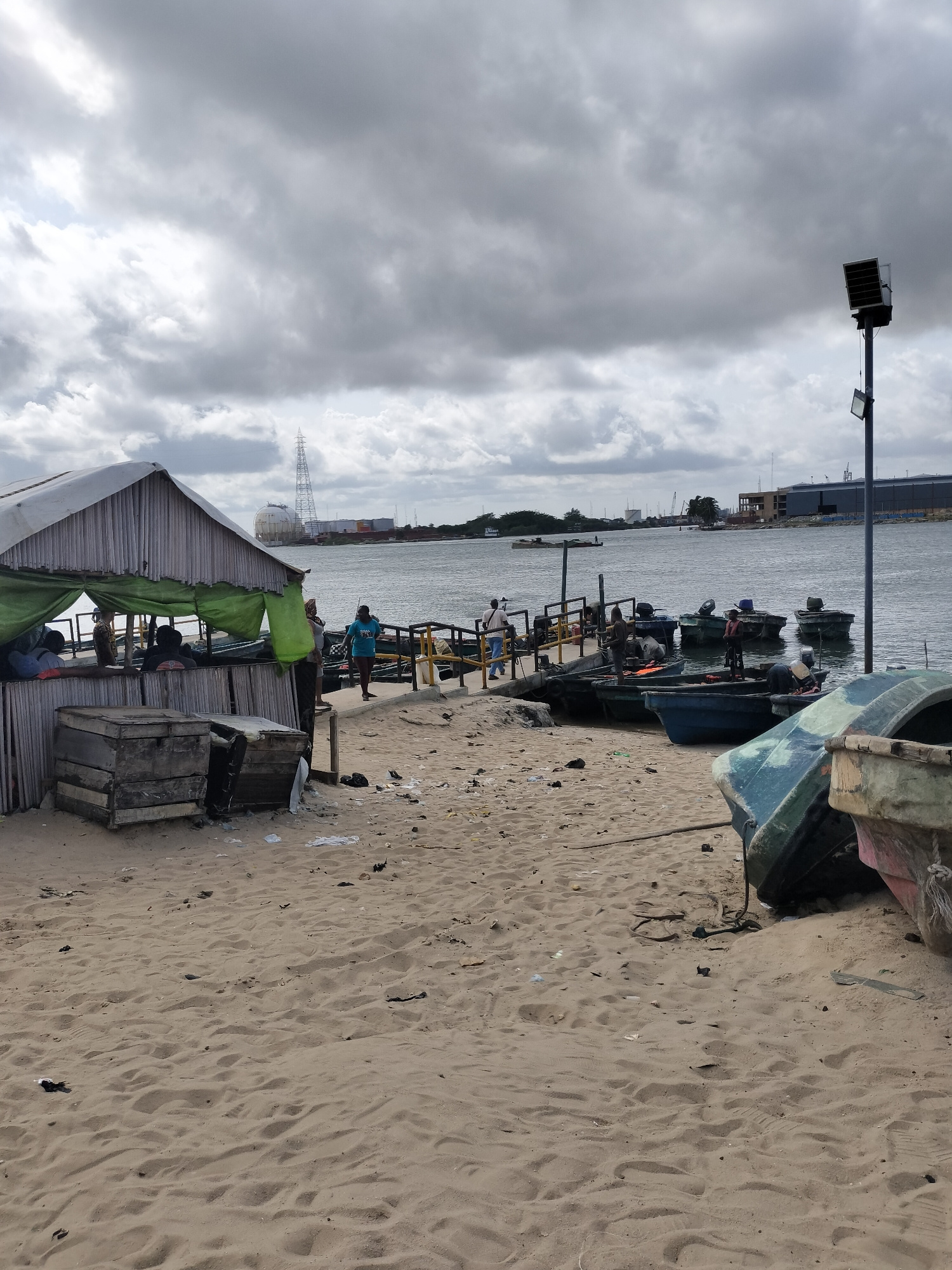 The image depicts a waterfront scene in Lagos, Nigeria. The foreground is dominated by a sandy beach littered with debris. There is a makeshift structure on the left, seemingly a shaded shelter, const…read more