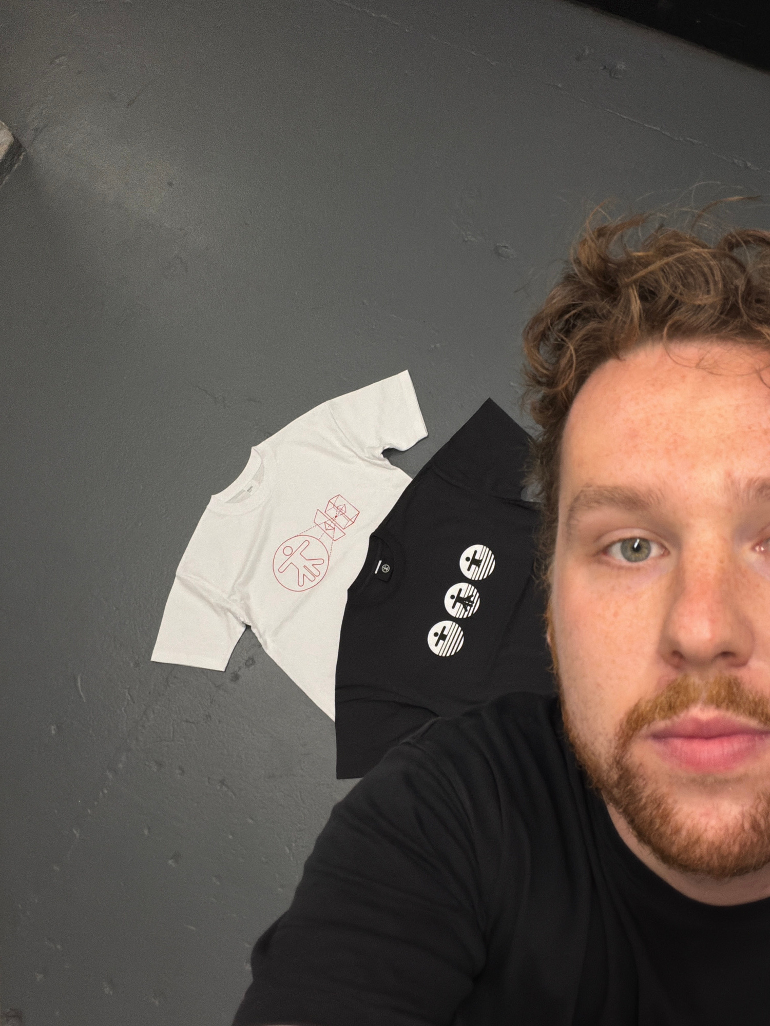 A person with fair skin, curly brown hair, blue eyes, and a beard is positioned in the upper right quadrant of the image. They are wearing a black t-shirt and are oriented so their face is prominent.…read more