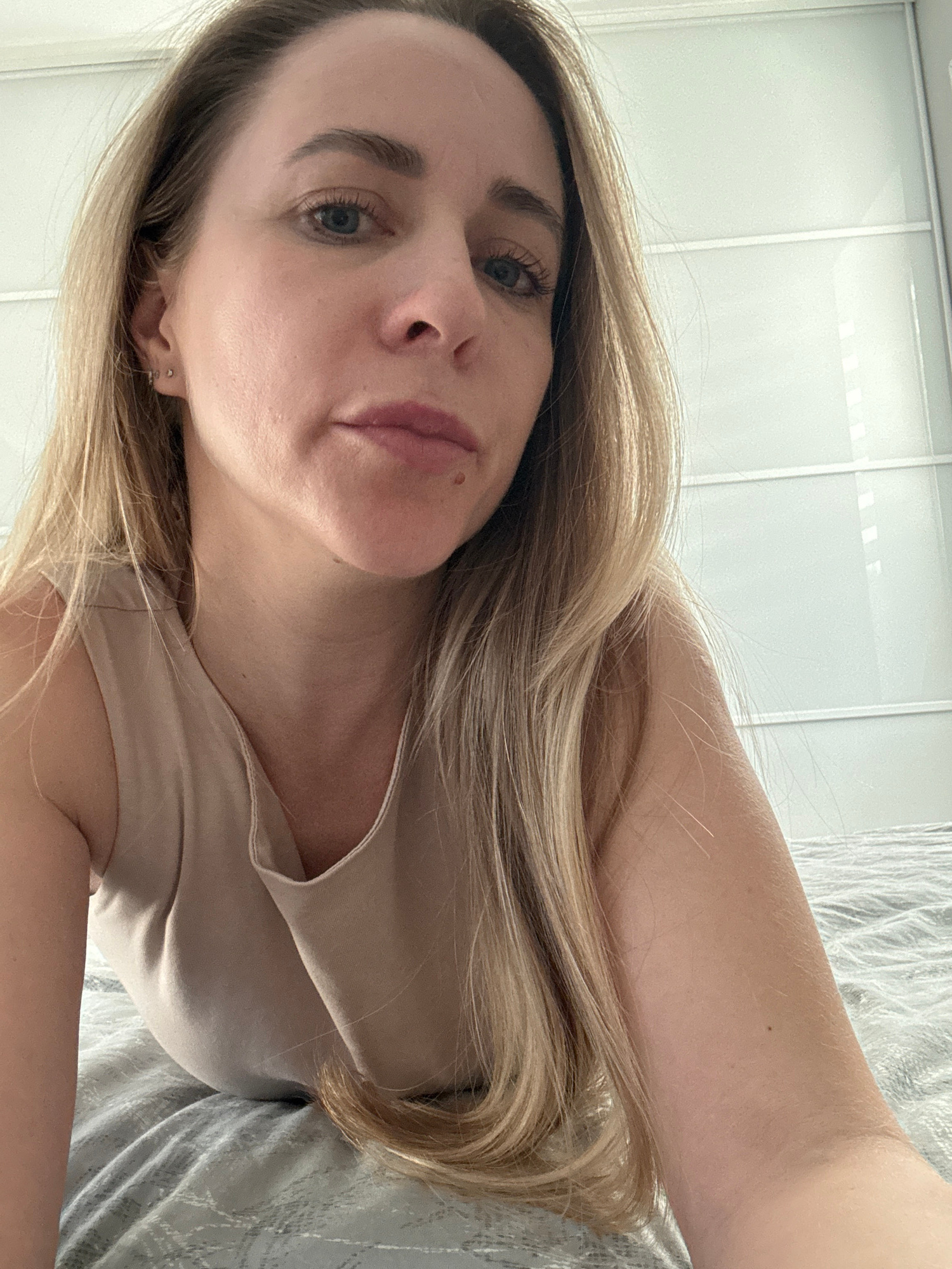 A young woman with long, wavy blonde hair and blue eyes is the central subject of this sideways-oriented selfie. She is depicted lying down, likely on a bed or sofa, indicated by the grey and white pa…read more