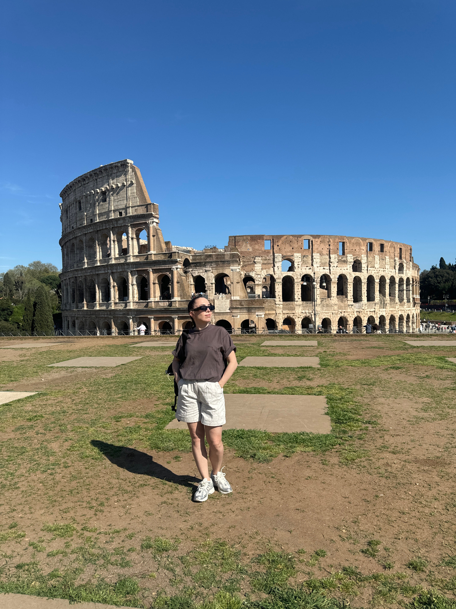 The photograph shows a person standing in front of the Colosseum in Rome, Italy. The person is wearing sunglasses, a brown shirt, and white shorts with white sneakers. The Colosseum is in the backgrou…read more