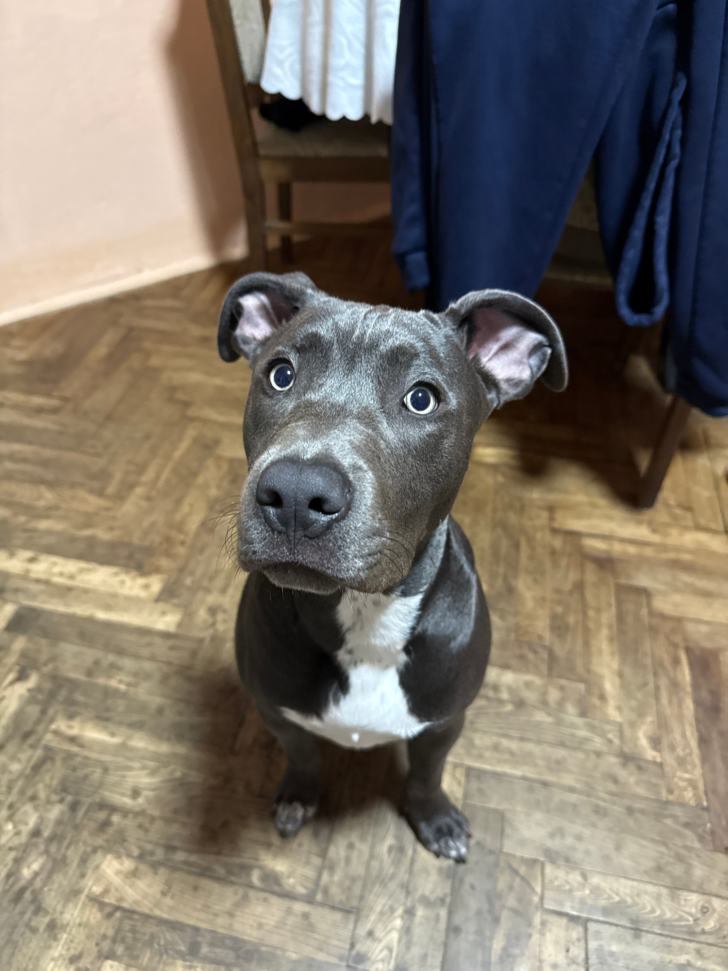 A gray and white pit bull-type dog sits on a parquet floor, looking up at the camera. The dog has large, round eyes and a black nose. Part of a dark blue fabric item is visible to the left, and what a…read more