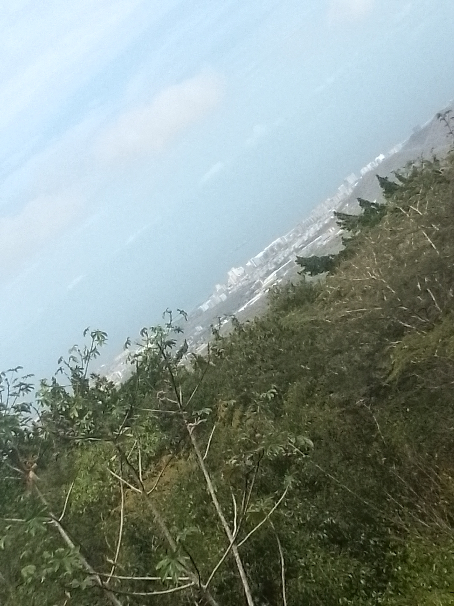 A landscape photograph shows a view from an elevated, sloping position, potentially a hill or mountain. Predominantly, the foreground is filled with green vegetation. Trees and shrubs dominate the vie…read more