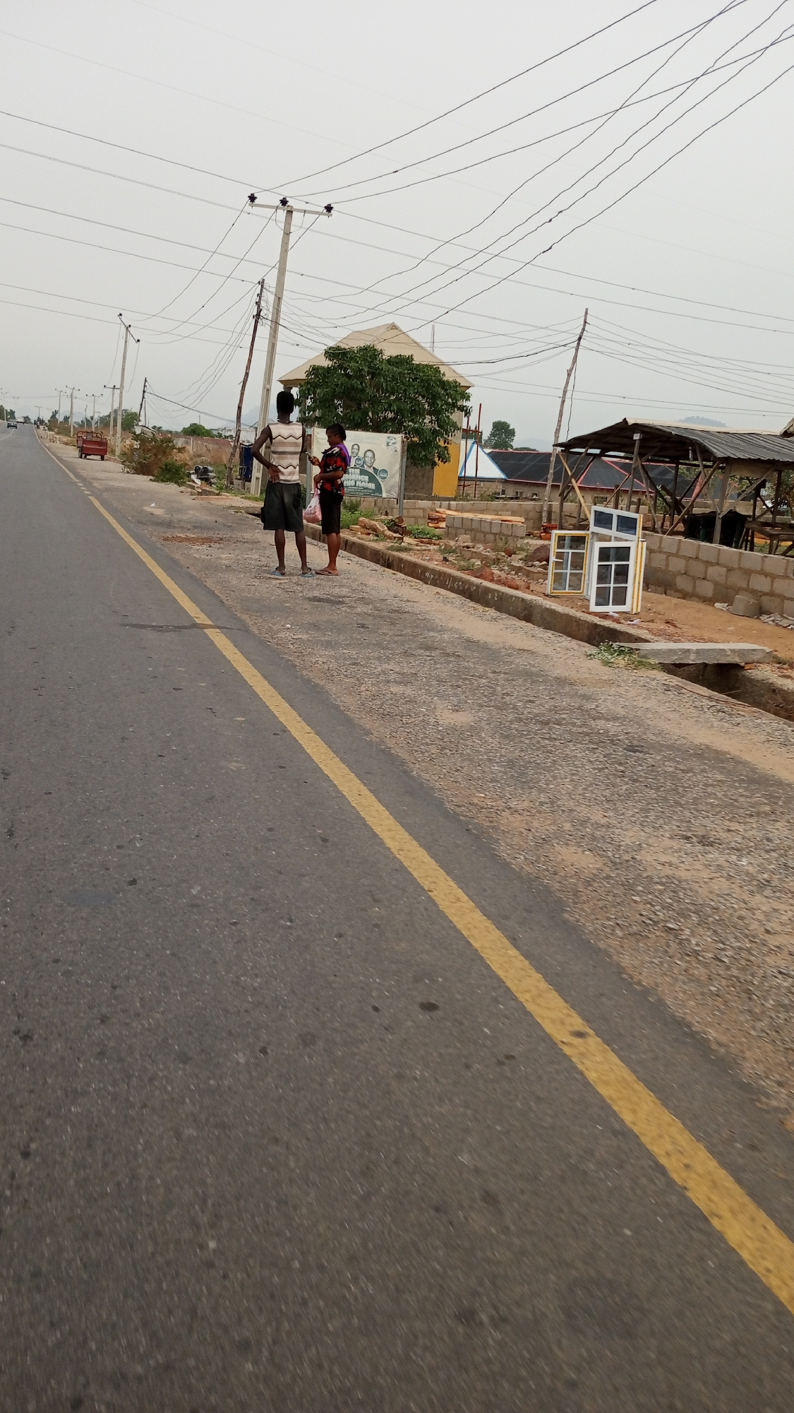 The image depicts a street scene in Adankolo, Nigeria. A yellow line runs along the left side of a two-lane asphalt road. On the right shoulder of the road, two individuals are standing; one is wearin…read more