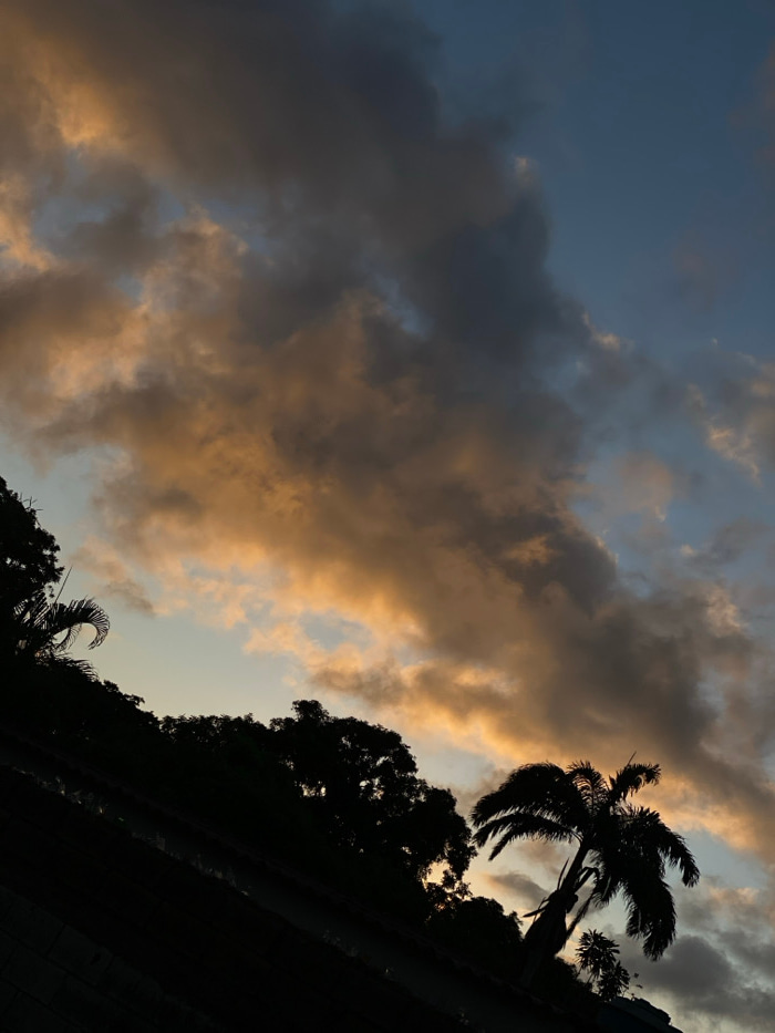 An image shows a dramatic sky with dark and golden clouds, likely during sunset or sunrise. Silhouetted against the sky are palm trees and other vegetation, suggesting a tropical or subtropical locati…read more