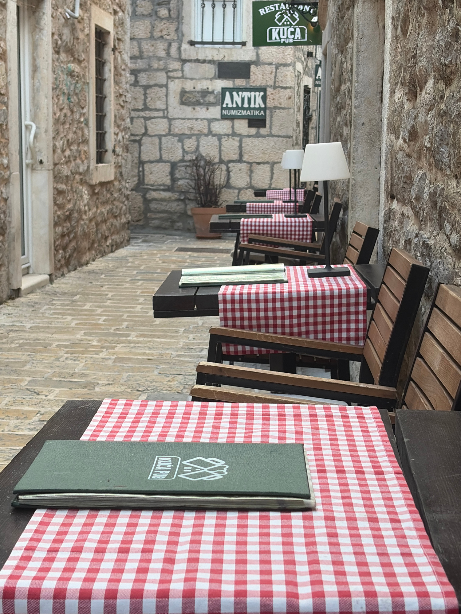 The image captures a scene in the city of Budva, Montenegro. It shows a row of small outdoor dining tables with red and white checkered tablecloths. Each table is set with a green menu bearing the log…read more