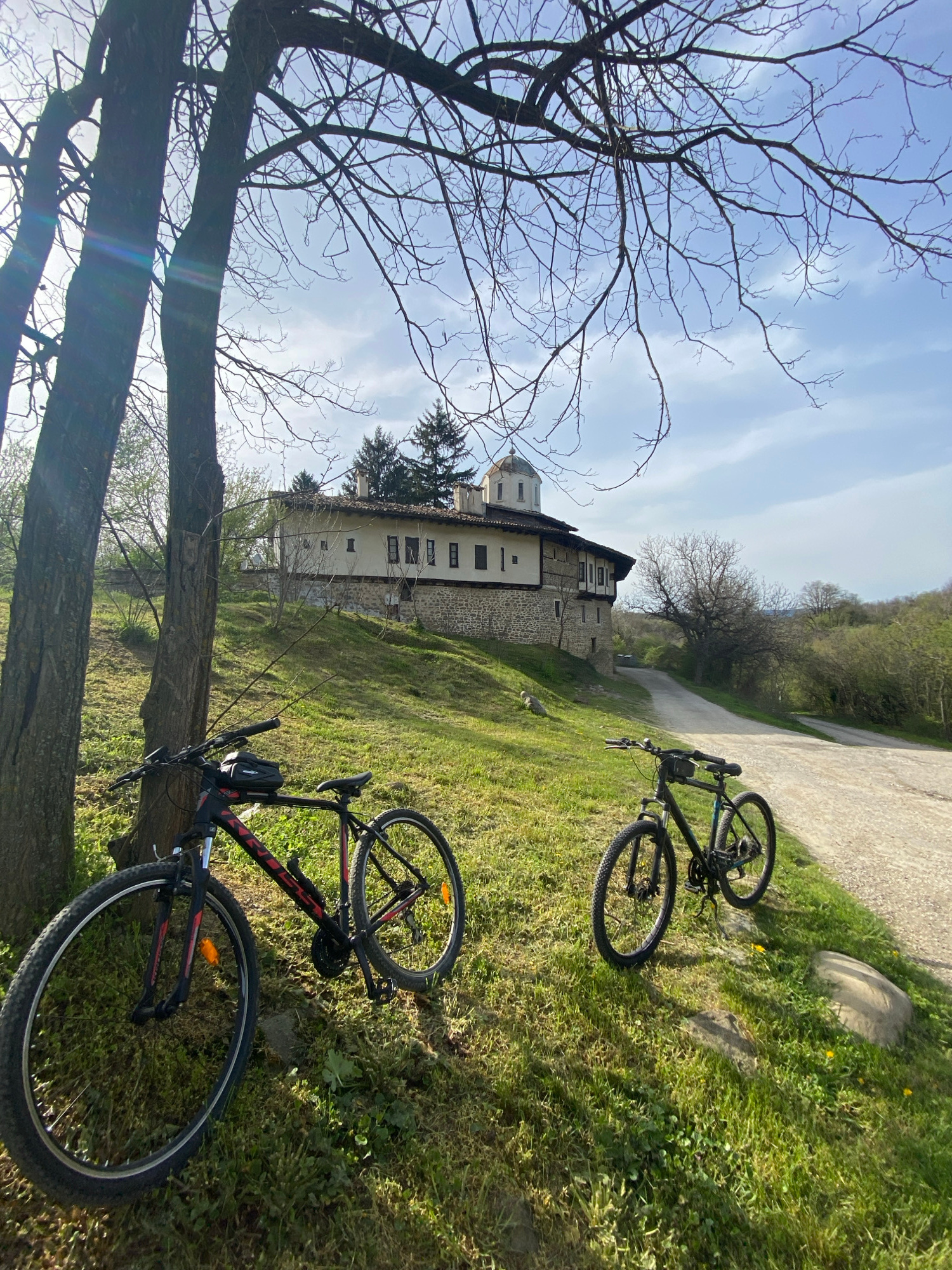 The image shows a landscape in Pchelishte, Bulgaria. A stone building with a dome is visible in the background, possibly a monastery or church. Two mountain bikes are lying on the grass, one black and…read more