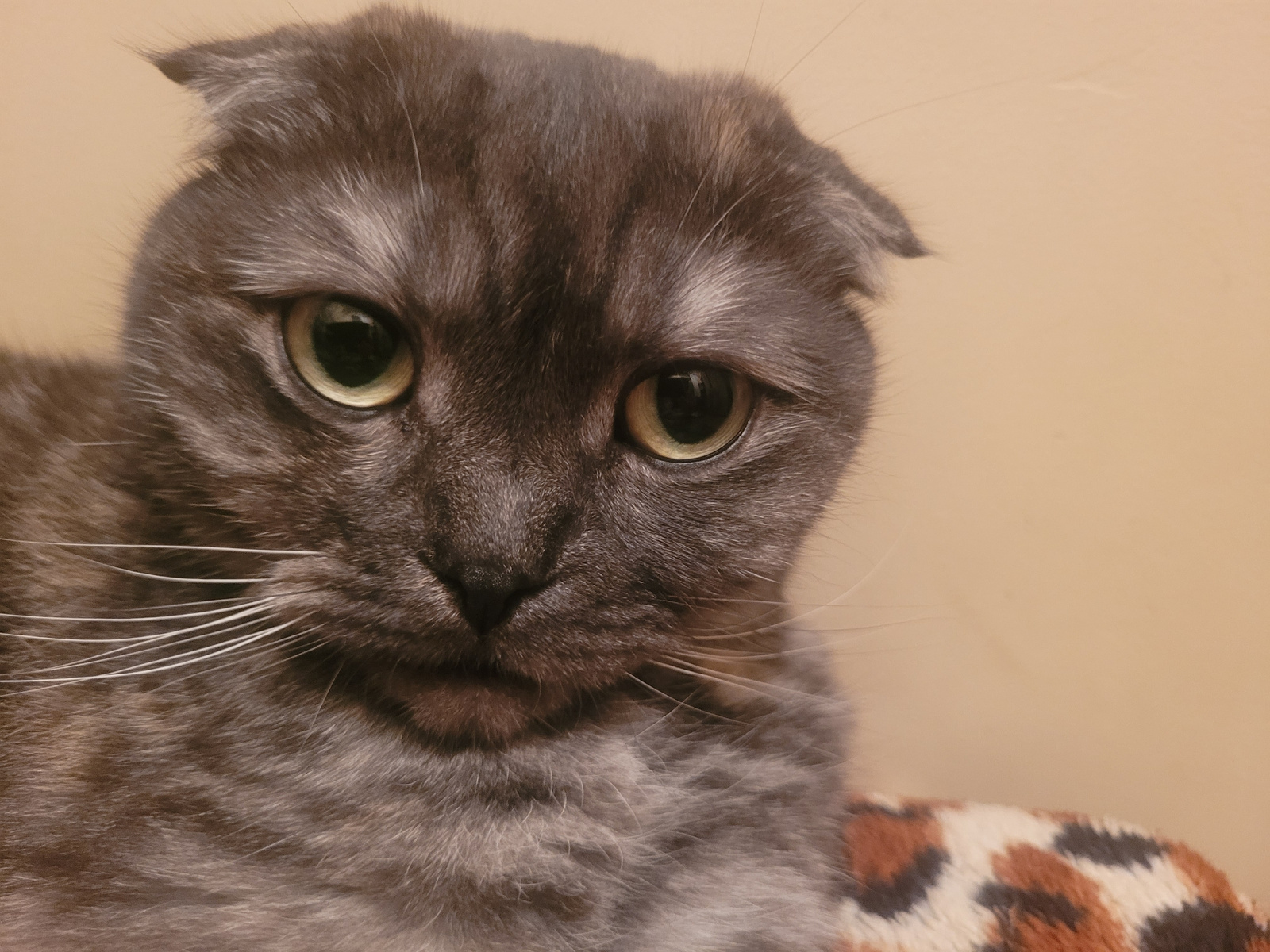 A close-up, inverted, eye-level view of a gray cat with green eyes against a light beige background. Part of an animal-print object is in the upper left. There is no indication in the image that indic…read more