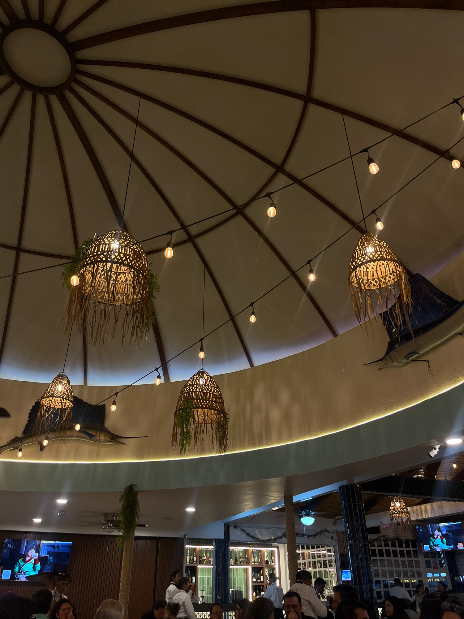 The image captures an interior scene, possibly a restaurant, located in San Bernardino Tlaxcalancingo, Mexico. The primary focal point is the elaborate ceiling design, featuring a radial pattern of da…read more