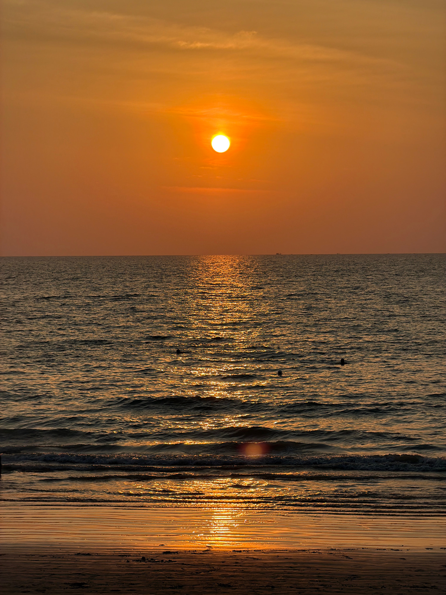 The image displays a sunset scene over Kamala Beach in Phuket, Thailand. The sky is filled with a dominant orange and amber gradient, featuring the bright, circular sun centered in the upper portion,…read more