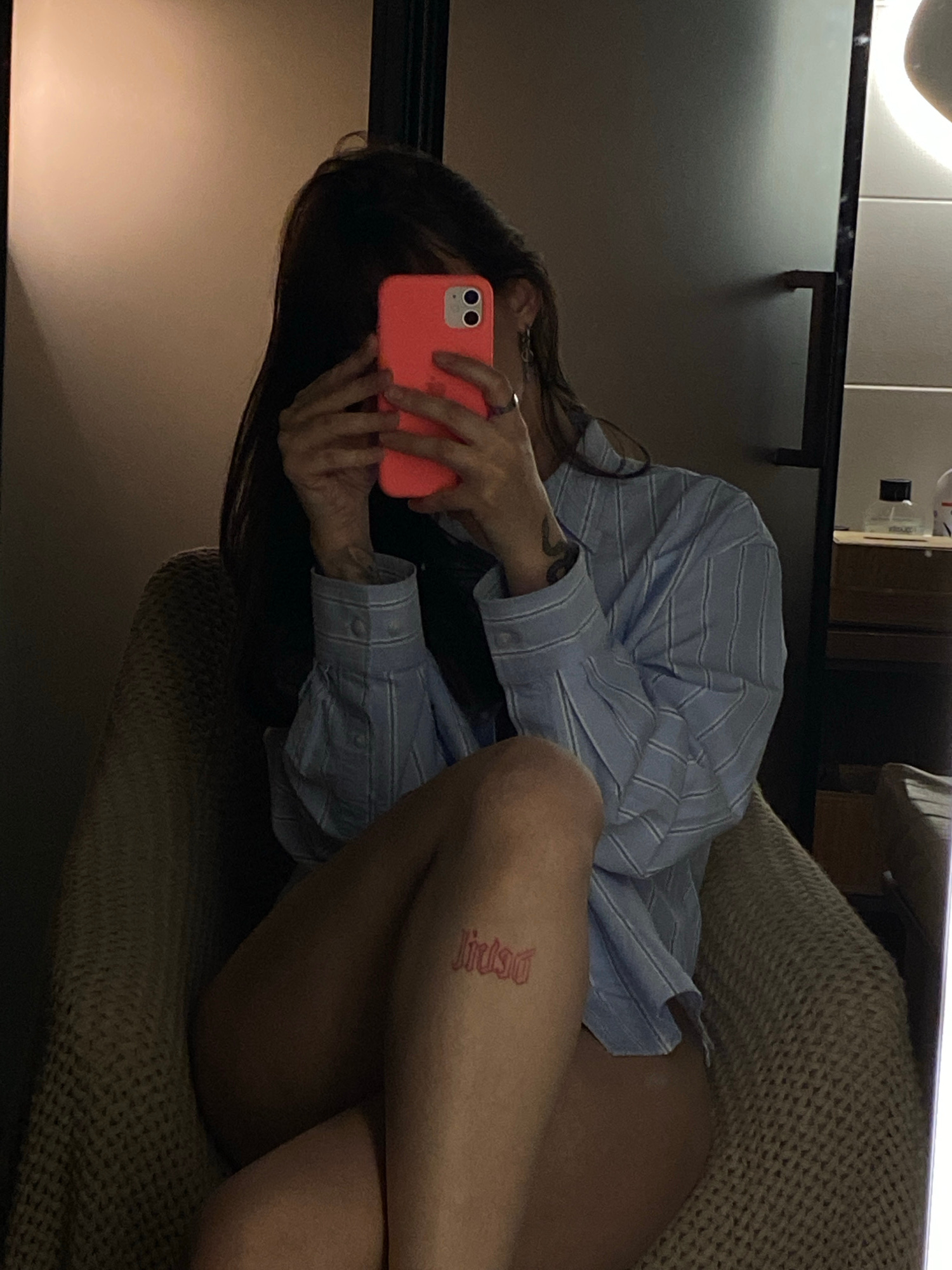 The image displays a mirror selfie of a person lying down in an indoor setting, rotated 90 degrees counter-clockwise from a natural upright orientation. The subject, with long dark hair, is positioned…read more