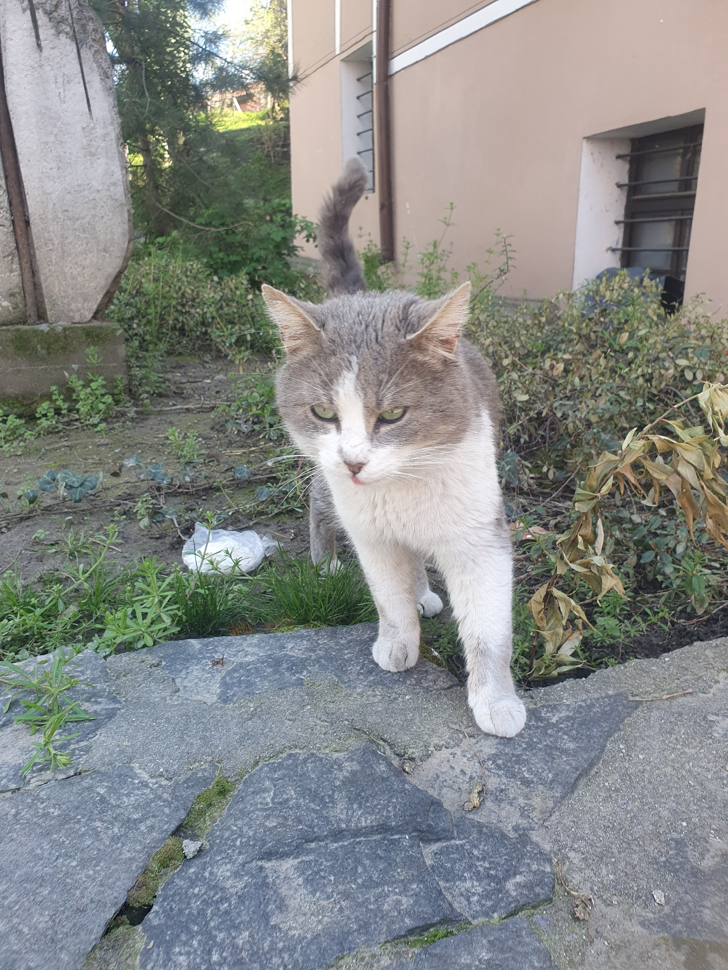 A gray and white cat stands on gray paving stones beside a patch of green vegetation and a bush with some dead leaves. In the background, a building wall with a window partially obscured by the bush iā¦read more