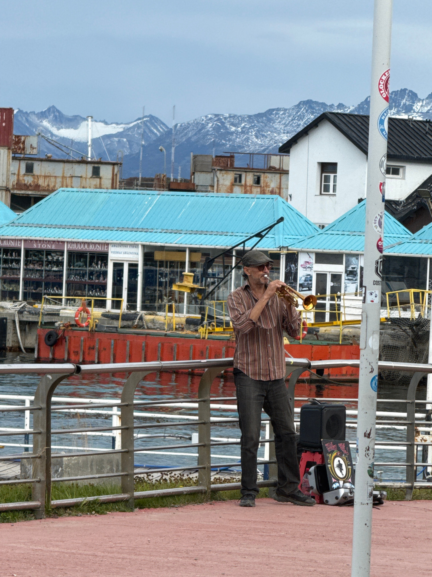 A street musician plays a trumpet outdoors in Ushuaia, Argentina. The man, wearing a striped shirt, gray hat, and dark pants, stands on a red paved area next to a metal railing. Behind the railing is…read more