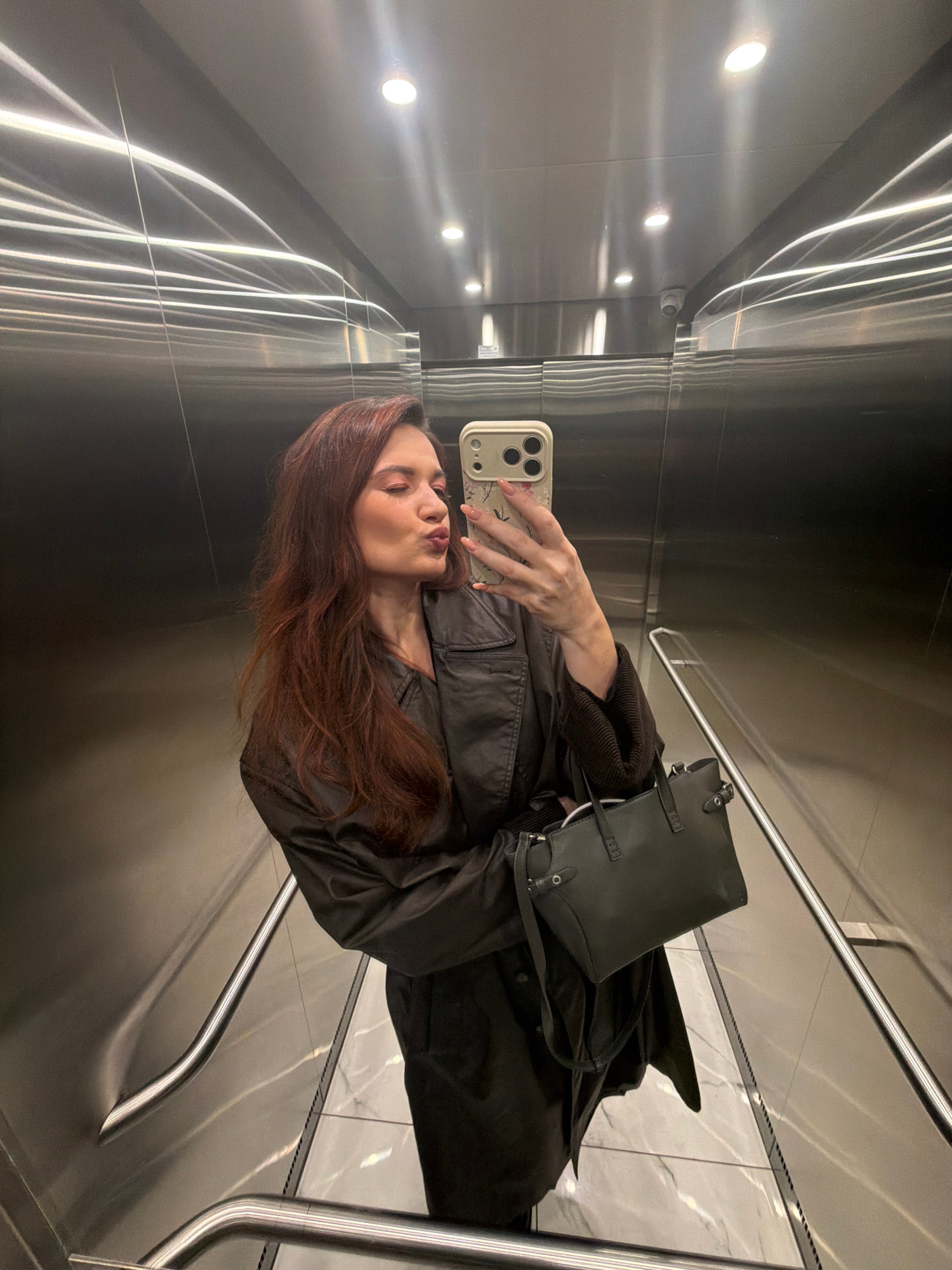 A person with long, auburn hair is taking a selfie in an elevator with stainless steel walls and linear lights. The person is wearing a black coat and a black handbag is visible. The elevator floor ap…read more
