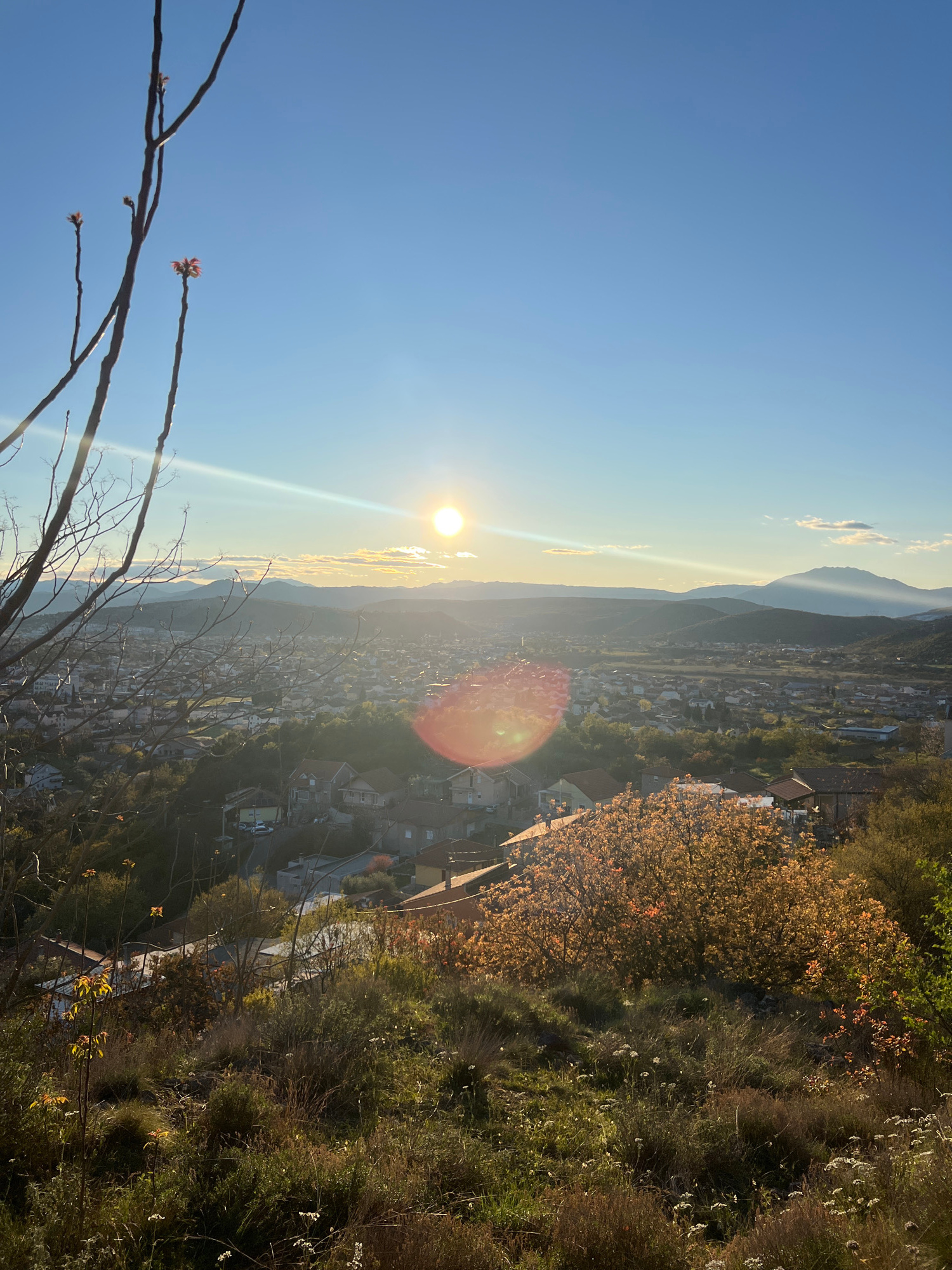 The image depicts a cityscape under a bright sun, likely taken from an elevated position. The sky is clear blue, with a visible sun and lens flare. Below, a valley is filled with houses and roads. Mou…read more