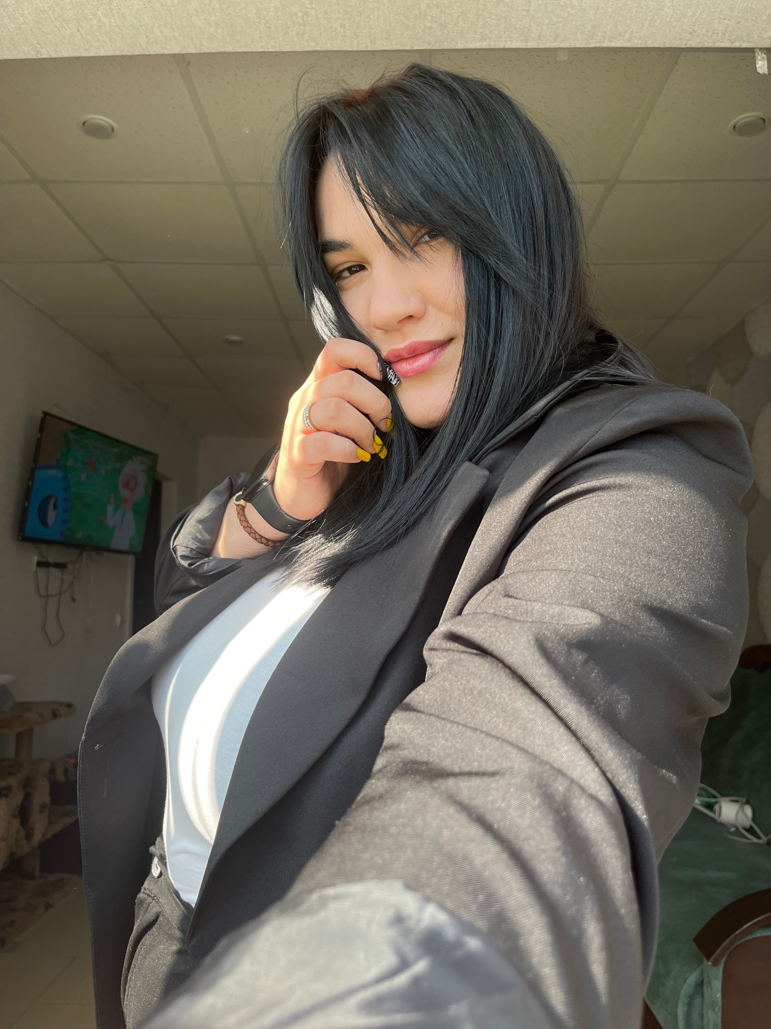 A young woman with long, dark hair, fair skin, and pink lips is depicted smiling gently towards the viewer. She is wearing a black blazer over a white top or shirt. Her left hand is raised to her face…read more