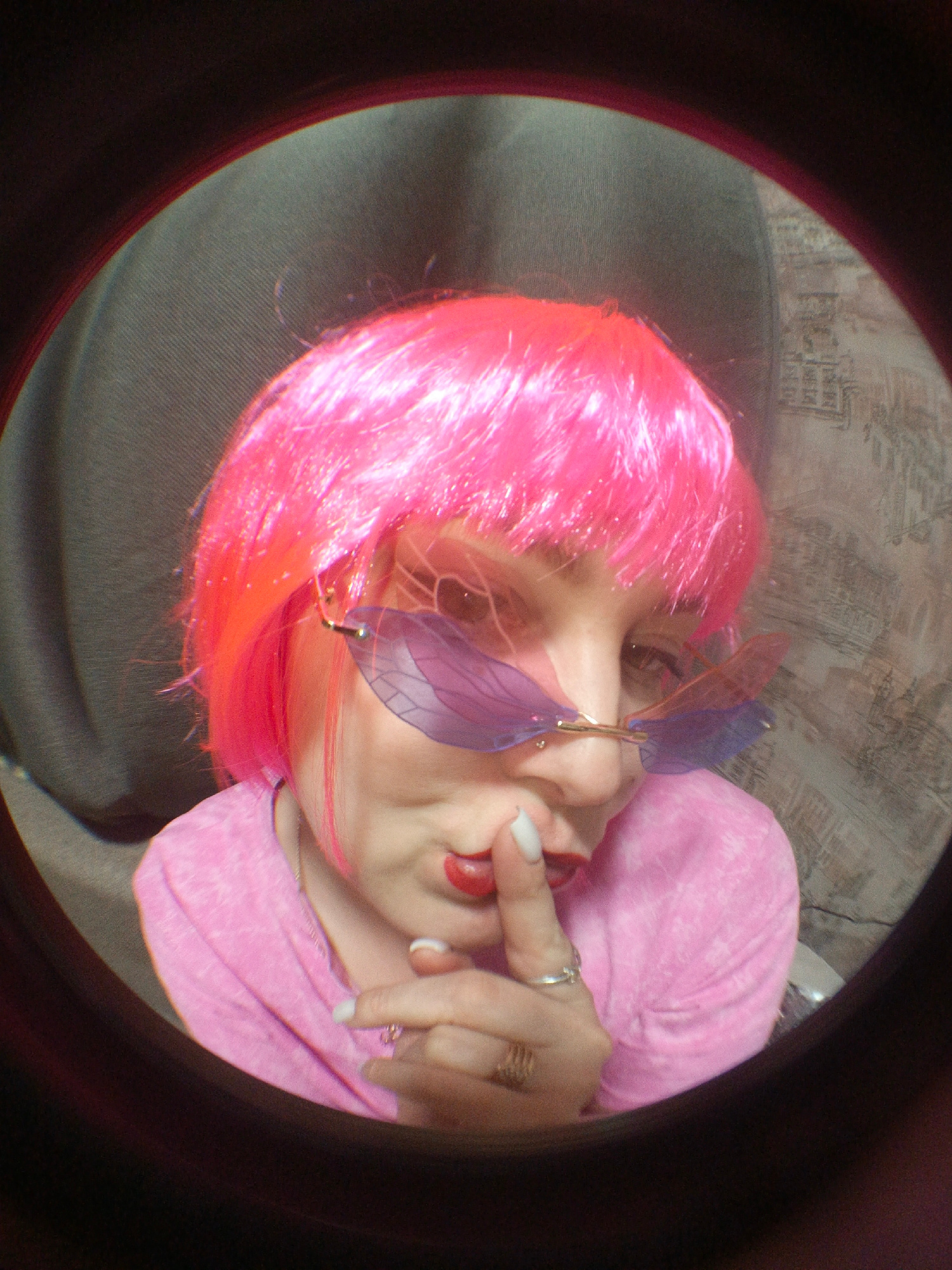 A person with pink hair, wearing sunglasses that resemble dragonfly wings, is holding a finger to their lips. They are wearing a pink shirt. The background shows a gray curtain and patterned wall. The…read more