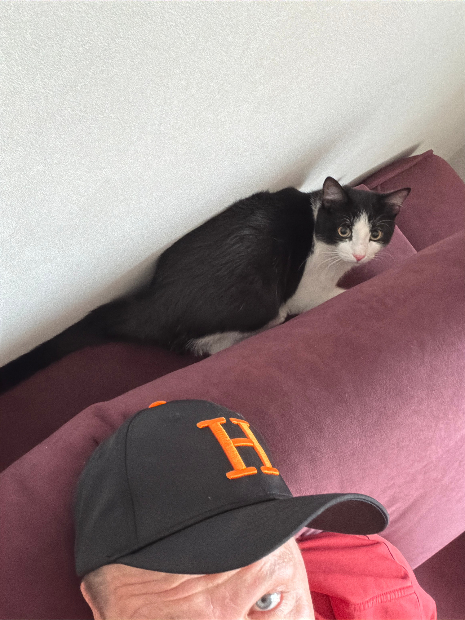 The image presents a black and white cat with a long tail lying on a white surface next to a plush, purple couch. A person wearing a red shirt and a black baseball cap with an orange "H" is positioned…read more